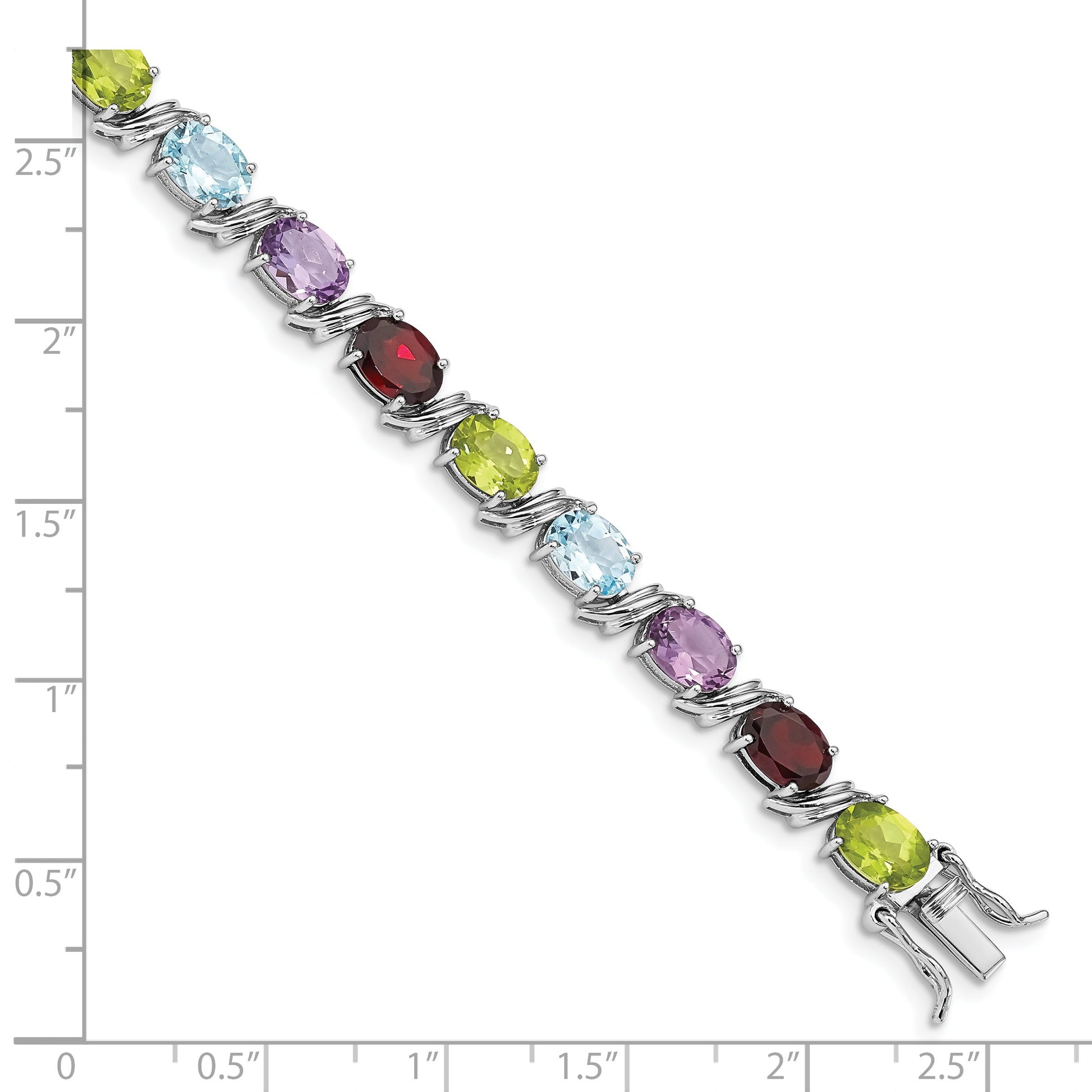 Discover the elegance of the 7.5 Inch Sterling Silver Rhodium-Plated Oval Multi-Gemstone Bracelet. Crafted from polished 925 sterling silver, this bracelet gleams with vibrant gems. The bracelet features rich purple amethyst, fiery red garnet, serene sky blue topaz, and refreshing green peridot, each expertly cut into oval stones. With a combined total weight of over 14 carats, these natural gems dazzle in their rhodium setting. The secure box catch clasp ensures it stays put, allowing you to effortlessly elevate any outfit. Add this stunning Sterling Silver Rhodium-Plated Multi-Gemstone Bracelet to your collection and shine.