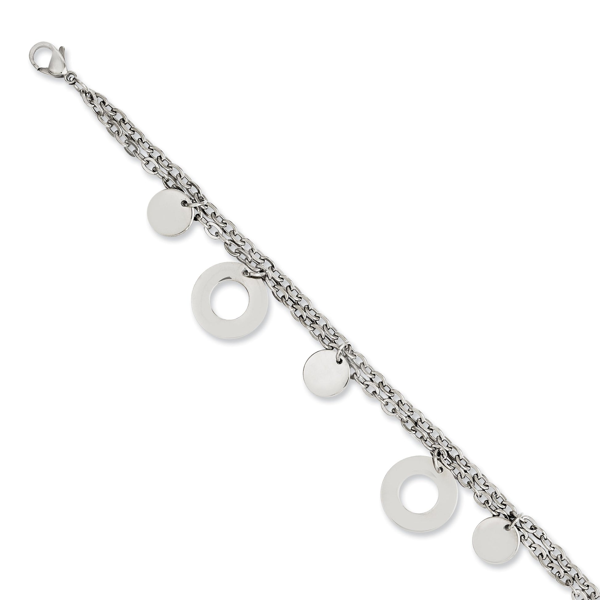 The 7.75 Inch Stainless Steel Polished Circles & Discs Bracelet adds elegance to any look. Crafted from durable stainless steel, this bracelet shines with a polished finish. Its length of 7.75 inches fits comfortably on most wrists, and the 5 mm chain width gives it a sophisticated feel. The fancy lobster clasp ensures it stays securely in place. Designed for women, this bracelet flaunts circles and discs, offering a modern twist. The stainless steel not only resists tarnish but also complements any outfit with a sleek, white hue. Elevate your style with the 7.75 Inch Stainless Steel Polished Circles & Discs Bracelet.