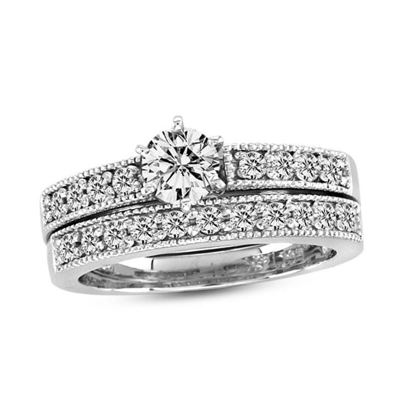 Manufactured in 14K white gold, this bridal ngagement ring features a stunning 1/2 ct. round diamond center stone standing tall in a traditional six-prong setting. The ring's shank glistens with smaller round accent diamonds bordered by intricate milgrain detailing.