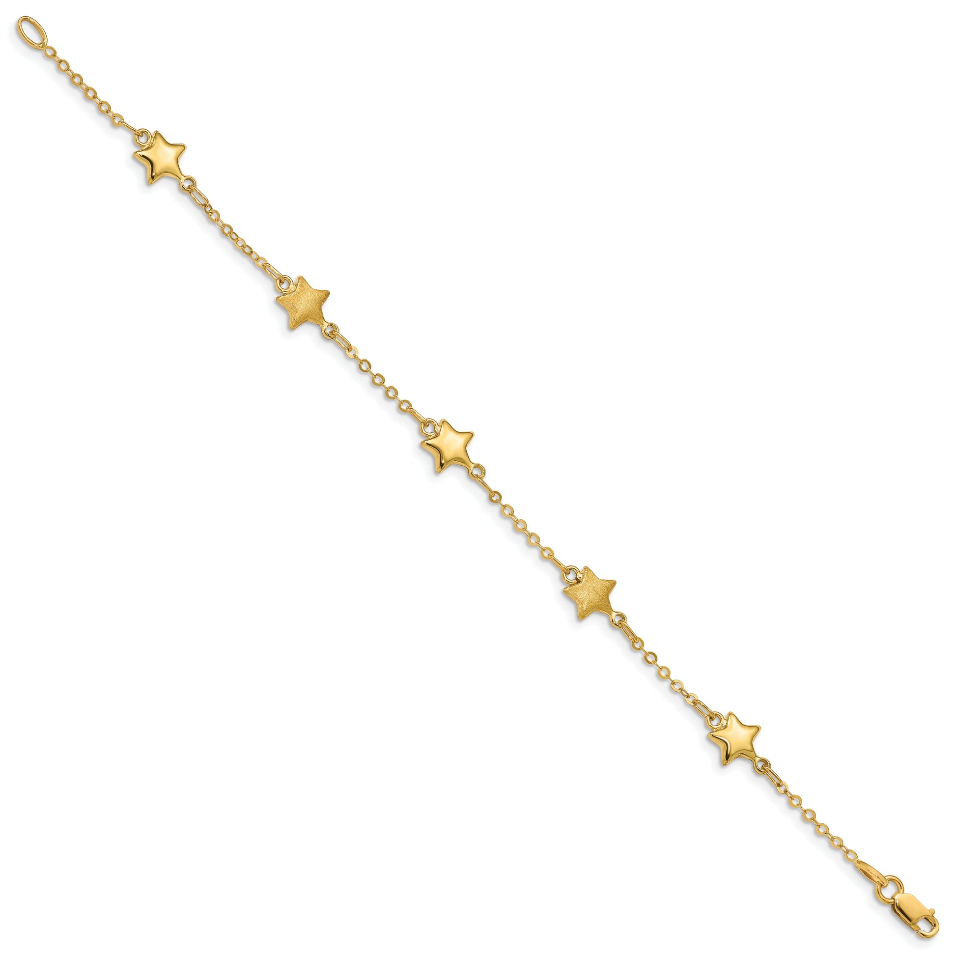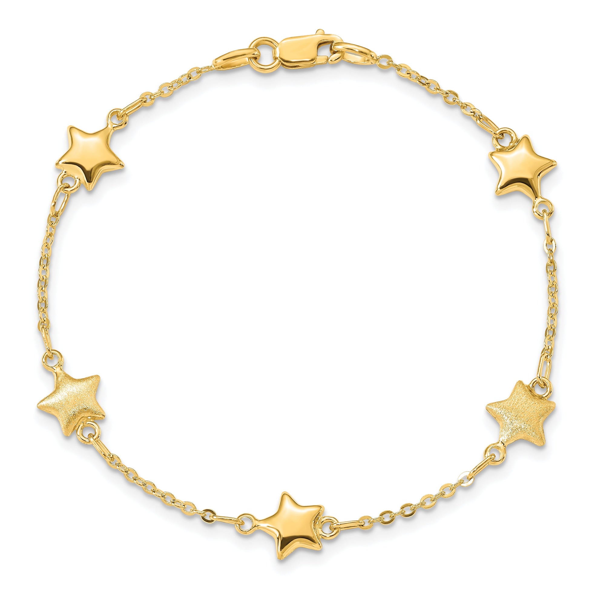 The 7 Inch 14K Brushed & Polished Stars Bracelet is a stunning accessory that adds a touch of glam to any outfit. Made from 14K yellow gold, this bracelet features a blend of polished and brushed textures, adding depth to its design. At seven inches in length, it fits comfortably on most wrists, and the lobster clasp secures it firmly. The bracelet's fancy chain is two millimeters wide with charming star elements, each seven millimeters across, seamlessly integrated into the design. Elevate your jewelry collection with the timeless appeal of the 7 Inch 14K Brushed & Polished Stars Bracelet.