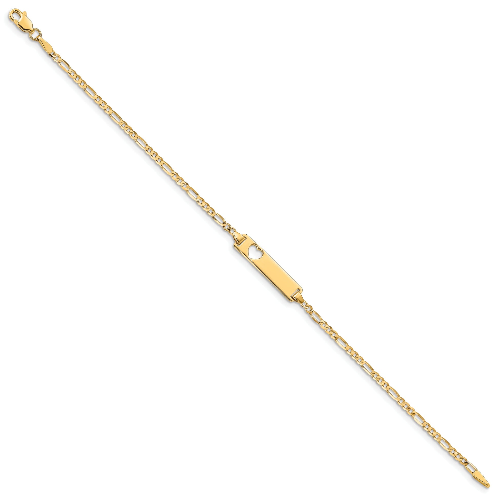 Discover elegance with the 7 Inch 14K Cut-Out Heart Figaro Link ID Bracelet. This unisex bracelet, crafted from genuine 14K yellow gold, is designed for anyone seeking sophistication. The bracelet features a polished finish, giving it a subtle gleam that catches the eye. A charming cut-out heart and engravable ID plate elevate its style, making it a perfect gift or personal statement piece. At 7 inches long and 5 mm wide, the Figaro link chain offers both durability and comfort, secured with a reliable lobster clasp. Make a lasting impression with the 7 Inch 14K Cut-Out Heart Figaro Link ID Bracelet.