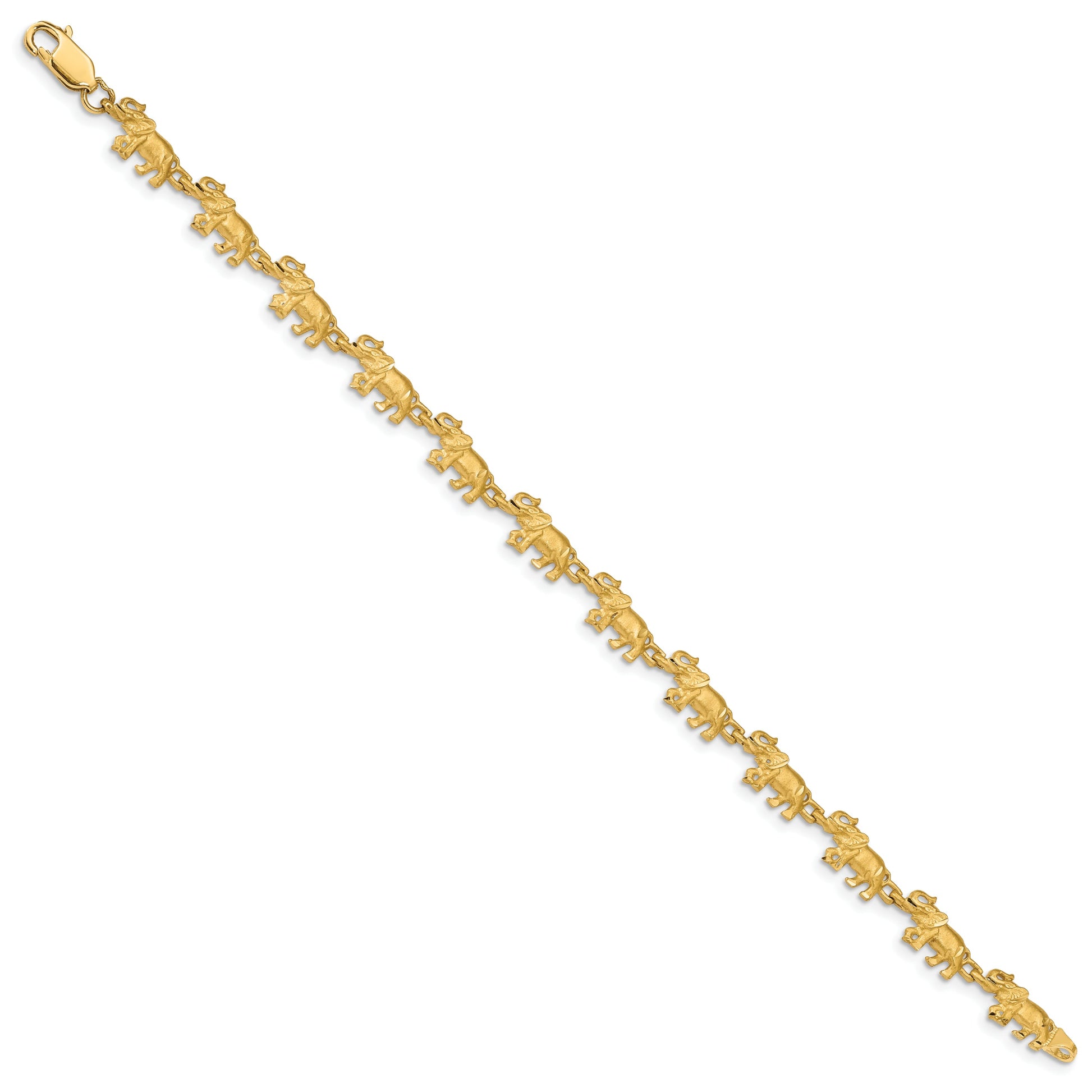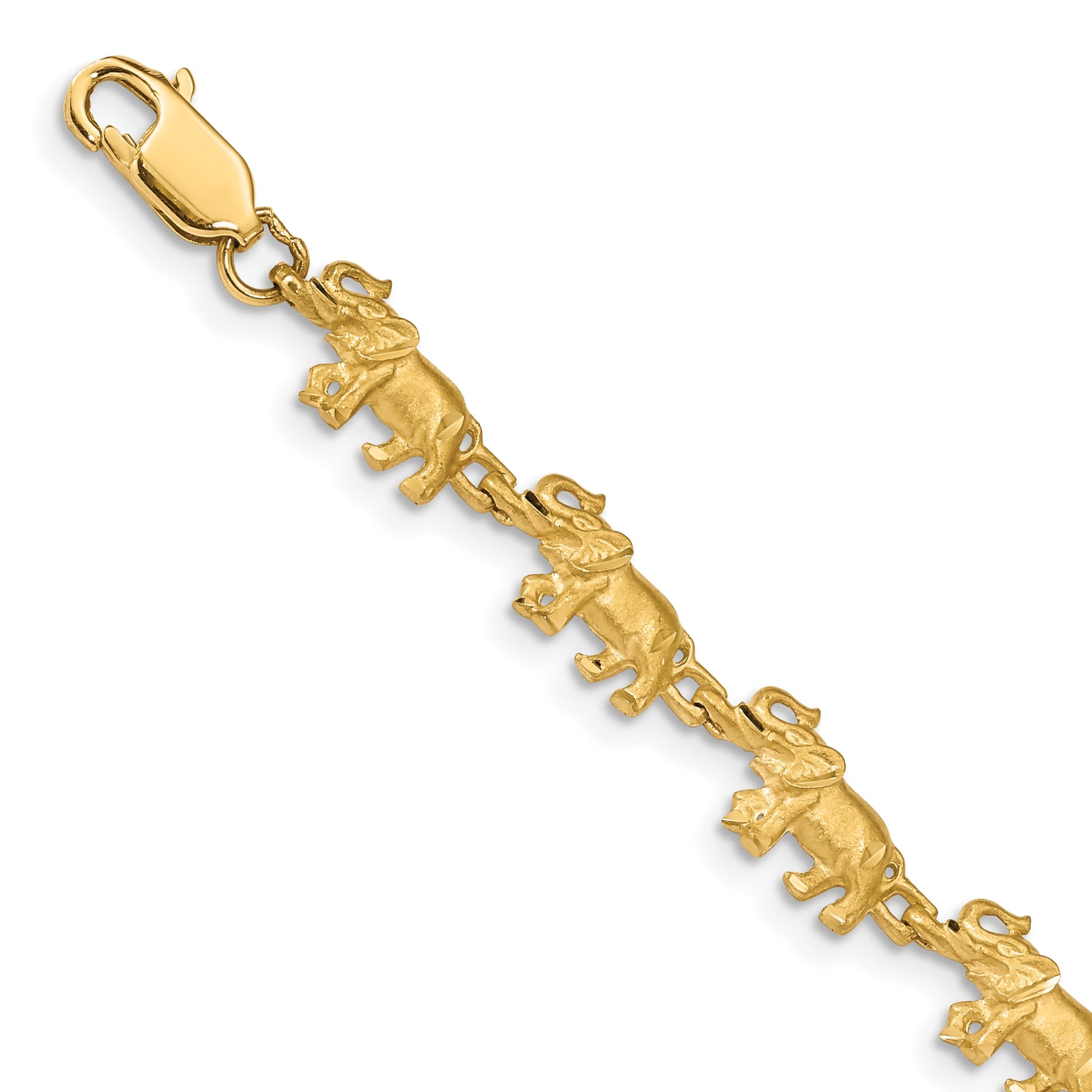 Introducing our stunning 7 Inch 14K Elephant Bracelet, a true marvel in fine jewelry. This exquisite bracelet, crafted from high-quality 14K yellow gold, shimmers with elegance. Measuring 7 inches in length and featuring a secure lobster clasp, it effortlessly combines durability and style. The bracelet's 6.5 mm width ensures a bold, yet refined look. Expertly casted, this solid piece is perfect for any occasion. Elevate your jewelry collection with the 7 Inch 14K Elephant Bracelet, a timeless accessory that effortlessly captures attention.