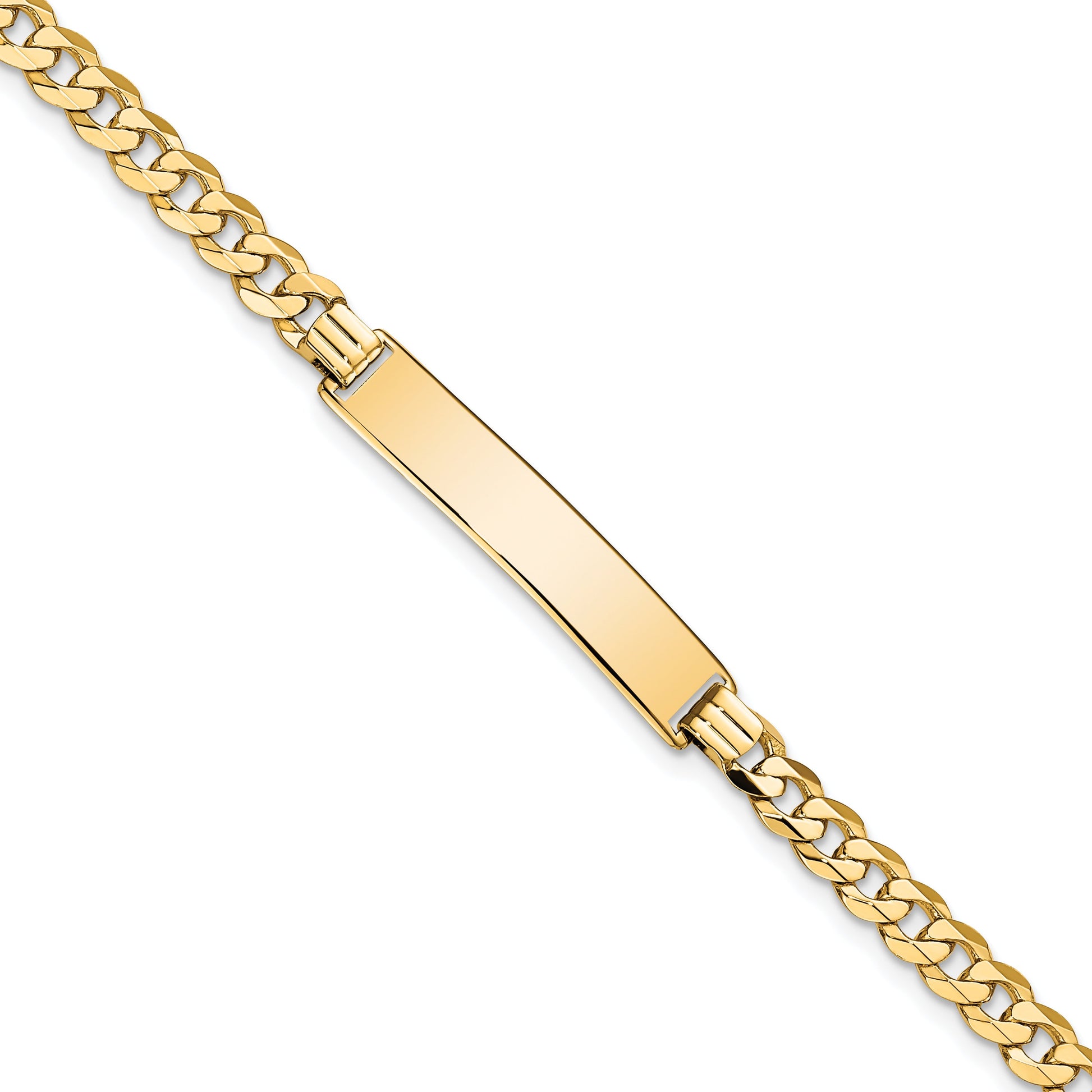 The 7 Inch 14K Flat Curb Link ID Bracelet is a timeless piece that adds a touch of class to any outfit. Crafted in high-quality 14K yellow gold, this bracelet features a sleek polished finish that highlights its elegant design. Its curb link chain offers a solid and sturdy feel, perfect for daily wear. Measuring 7 inches in length and 5 mm in width, this ID bracelet is both unisex and versatile. The lobster clasp ensures a secure fit. For added personalization, the bracelet is engravable, making it an ideal gift. The 7 Inch 14K Flat Curb Link Id Bracelet effortlessly combines style and function.