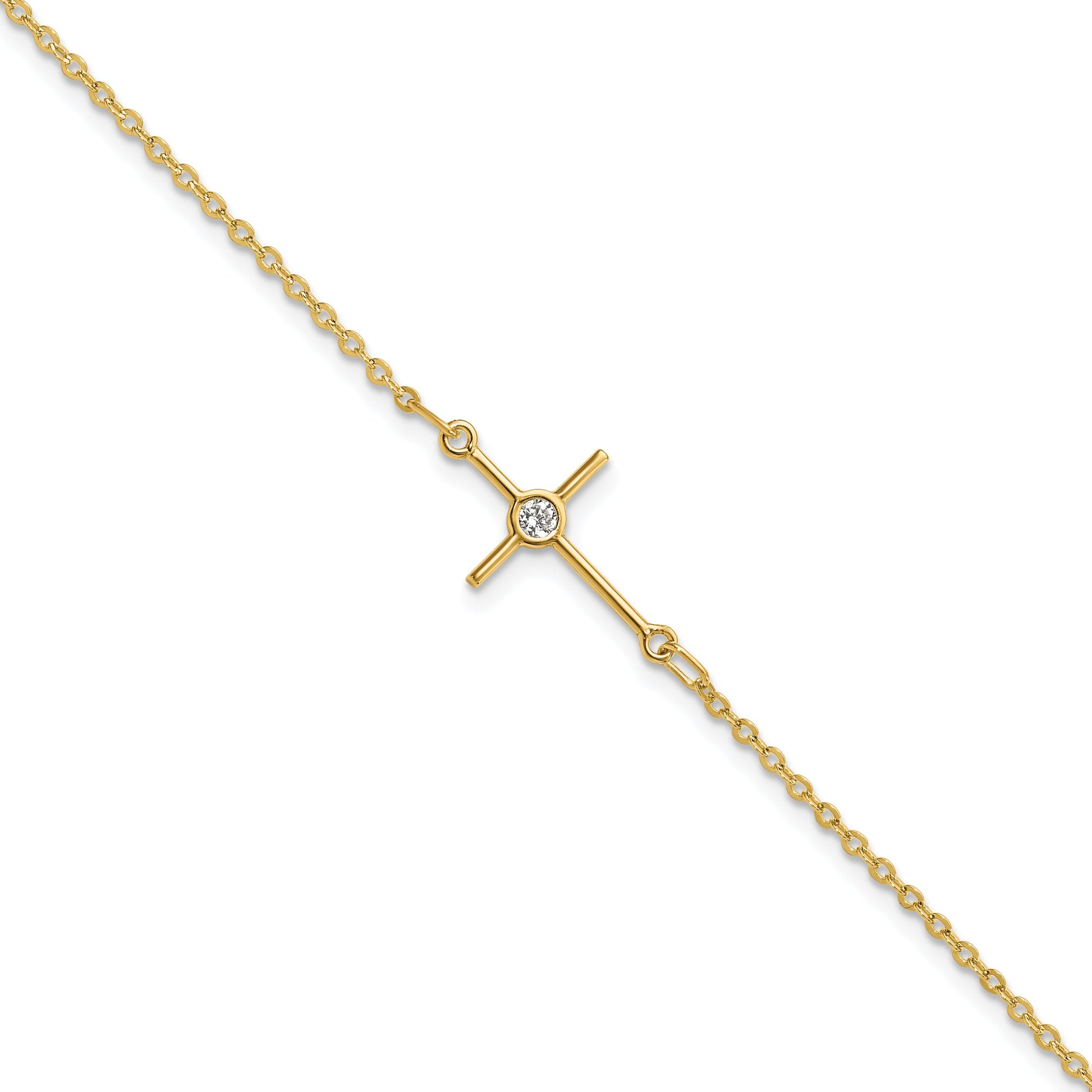 The 7 Inch 14K Polished Cz Cross 1In Ext. Bracelet elegantly combines beauty and craftsmanship. Made from 14K yellow gold, this piece dazzles with a single, bezel-set cubic zirconia that adds a touch of sparkle. The bracelet measures 7 inches and features a reliable lobster clasp, making it secure and easy to wear. A 1-inch extension ensures a comfortable fit for every wrist. The slender cable chain and cross charm are polished to perfection, showcasing sophistication. With a lifetime guarantee, the 7 Inch 14K Polished Cz Cross 1In Ext. Bracelet is a timeless treasure.