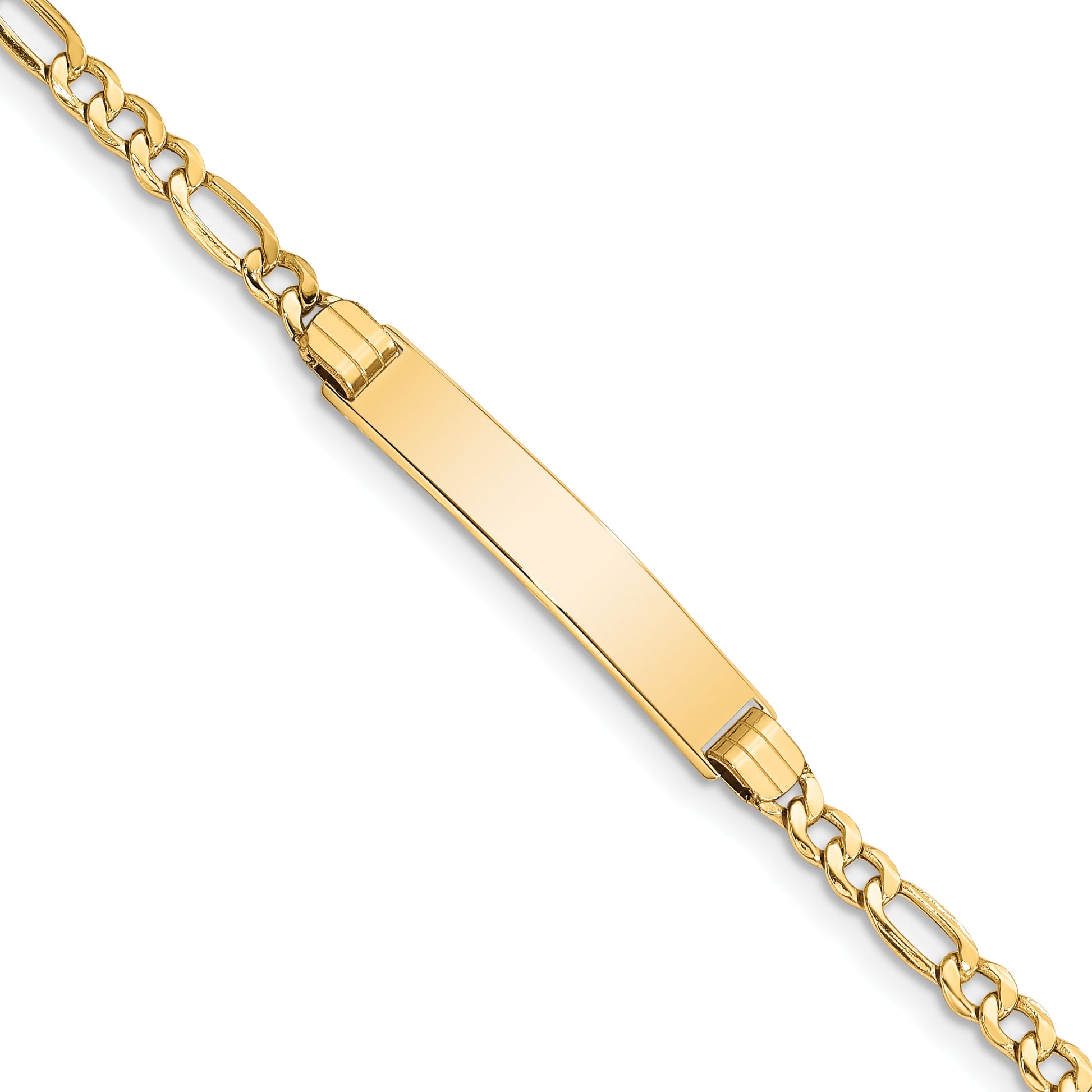 The 7 Inch 14K Semi-Solid Polished Figaro Link ID Bracelet is a blend of elegance and durability. Crafted from 14K yellow gold, this polished piece glistens with quality. Its 7-inch Figaro chain, featuring a width of 3.5 mm, offers both style and strength. A lobster clasp ensures it stays secure on your wrist. This bracelet also boasts an engravable ID charm, making it perfect for personal customization. Whether you are looking for a gift or a treat for yourself, the 7 Inch 14K Semi-Solid Polished Figaro Link ID Bracelet is an ideal choice.