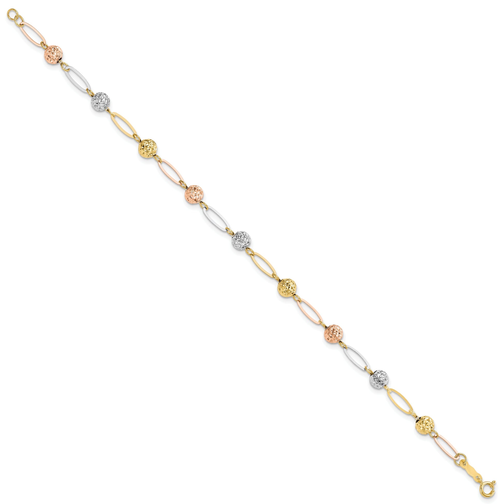 Elevate your style with the stunning 7 Inch 14K Tri-Color D/C Beads Link Bracelet. Crafted from high-quality 14K gold, this bracelet captures attention with its polished finish and dazzling diamond-cut design. Featuring a unique tri-color scheme, it effortlessly combines elegance and versatility for any occasion. The bracelet is composed of nine intricate elements, each measuring 5 mm in both length and width, linked together by a sleek 2 mm chain. Its secure spring ring clasp ensures a reliable fit. With its classic 7-inch length, the 7 Inch 14K Tri-Color D/C Beads Link Bracelet is a timeless addition to your jewelry collection.