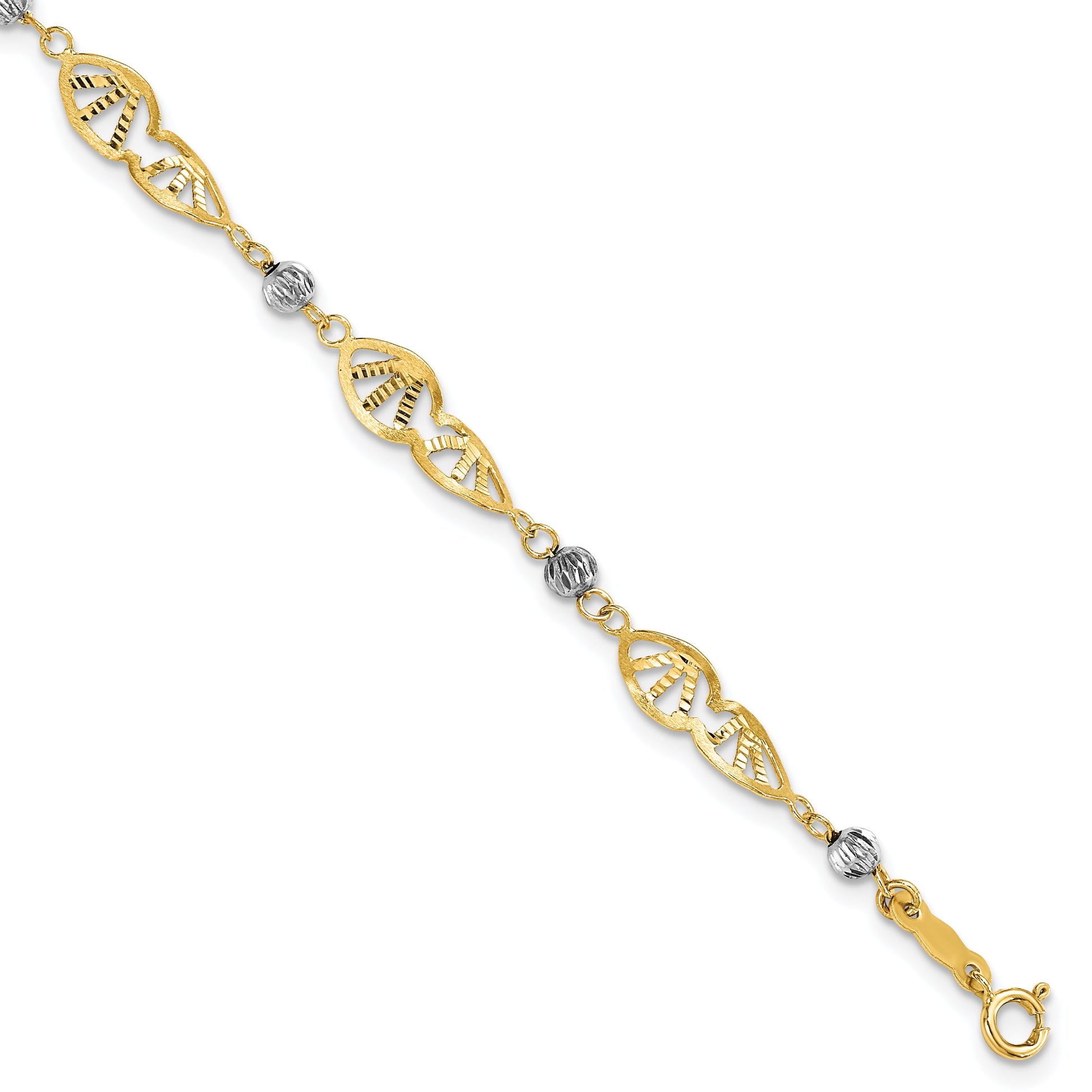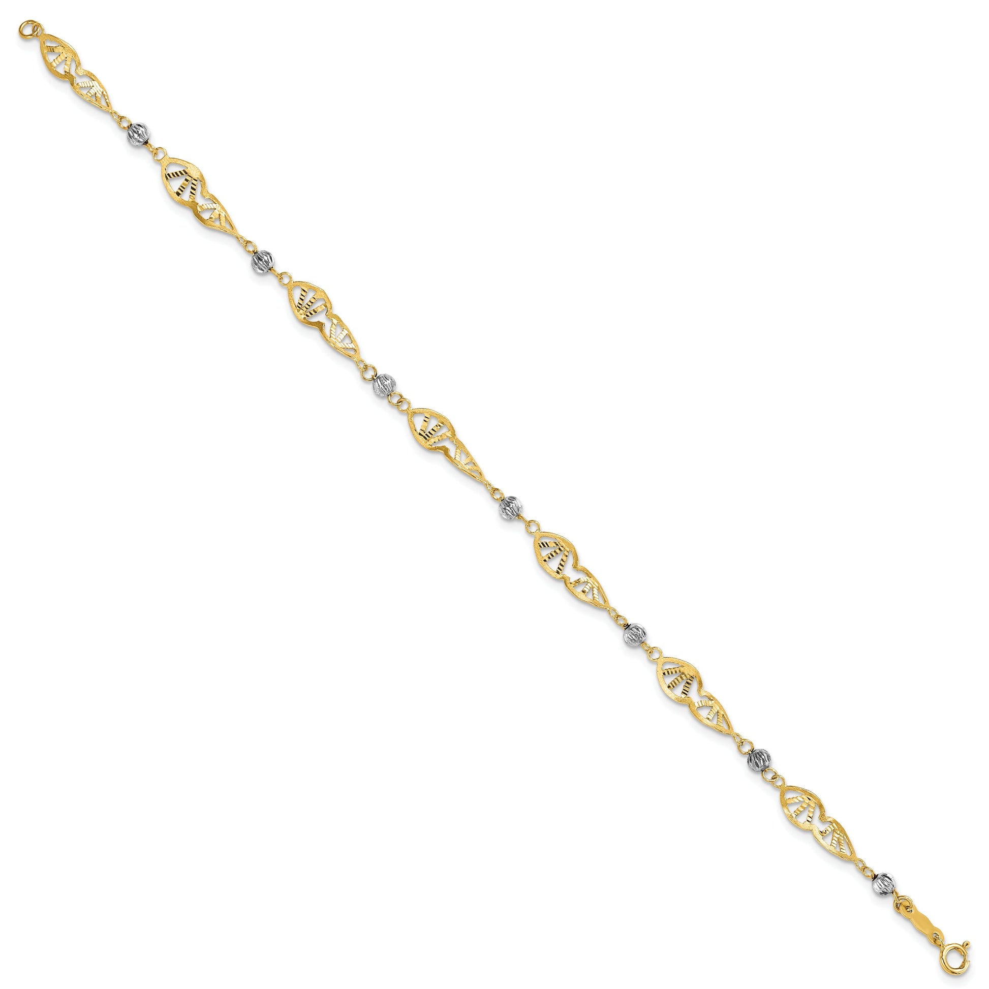 The 7 Inch 14K Two Tone Fancy Link Diamond-Cut Bracelet exudes elegance and sophistication. Crafted with 14K gold, this piece features a polished finish that adds a radiant glow. The seven-inch fancy chain boasts a diamond-cut texture, creating a sparkling effect that catches the eye. With a width of 5.25 mm, this bracelet strikes the perfect balance between bold and delicate. The secure spring ring clasp ensures the bracelet stays in place, providing peace of mind. The two-tone gold offers versatility, making it a stunning addition to any jewelry collection. Indulge in luxury with the 7 Inch 14K Two Tone Fancy Link Diamond-Cut Bracelet.