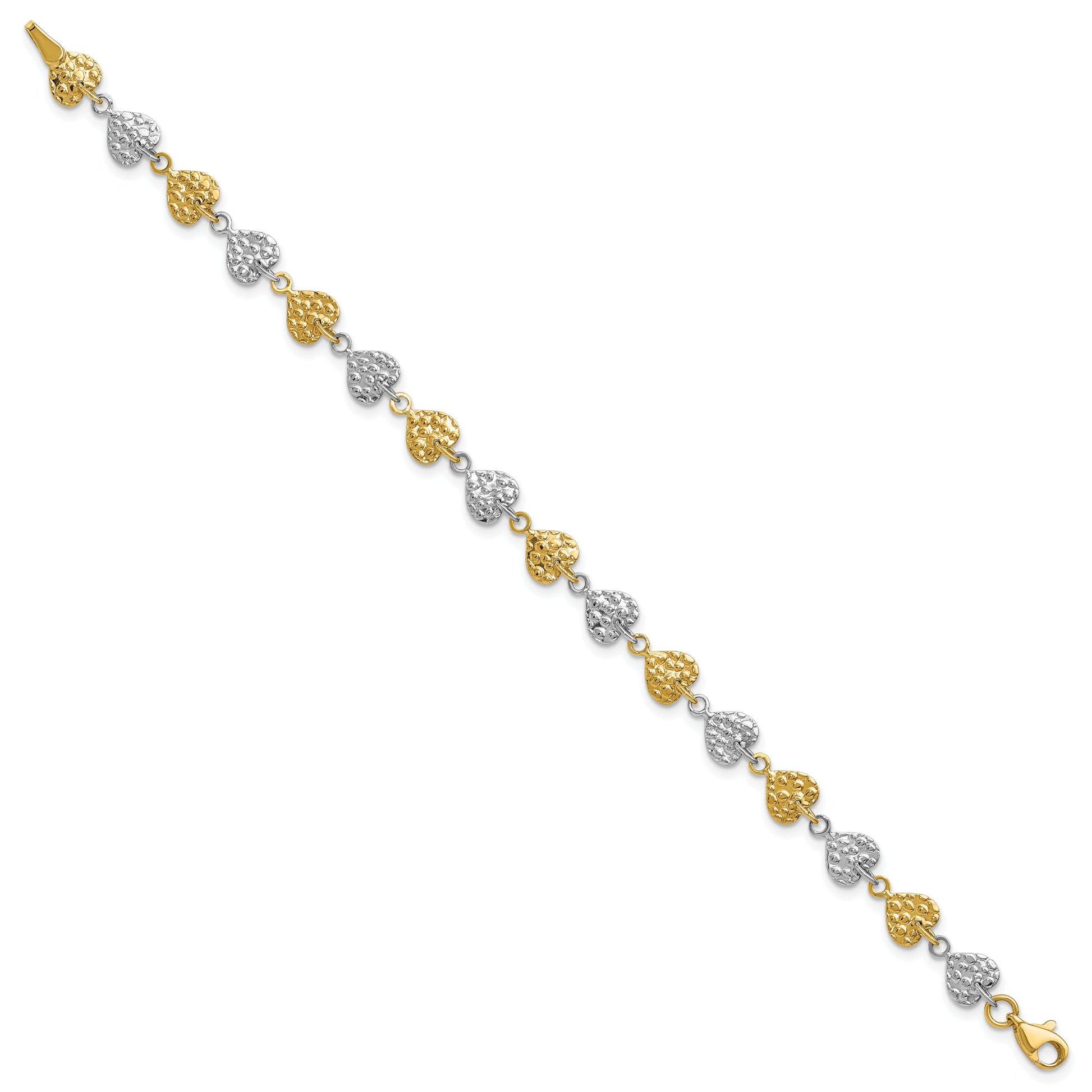 Discover elegance with the 7 Inch 14K Two-Tone Hammered Hearts Bracelet, an exquisite addition to any jewelry collection. Crafted from 14K gold, this women's bracelet features a unique link chain design that artfully blends dual tones and showcases hammered heart accents. Its semi-solid structure ensures a premium feel without compromising comfort. Measuring 7 inches, it sits beautifully on the wrist with a secure lobster clasp. Perfect for those who appreciate intricate craftsmanship, this bracelet offers a charming touch to any ensemble. Adorn your wrist with the 7 Inch 14K Two-Tone Hammered Hearts Bracelet and revel in its timeless beauty.