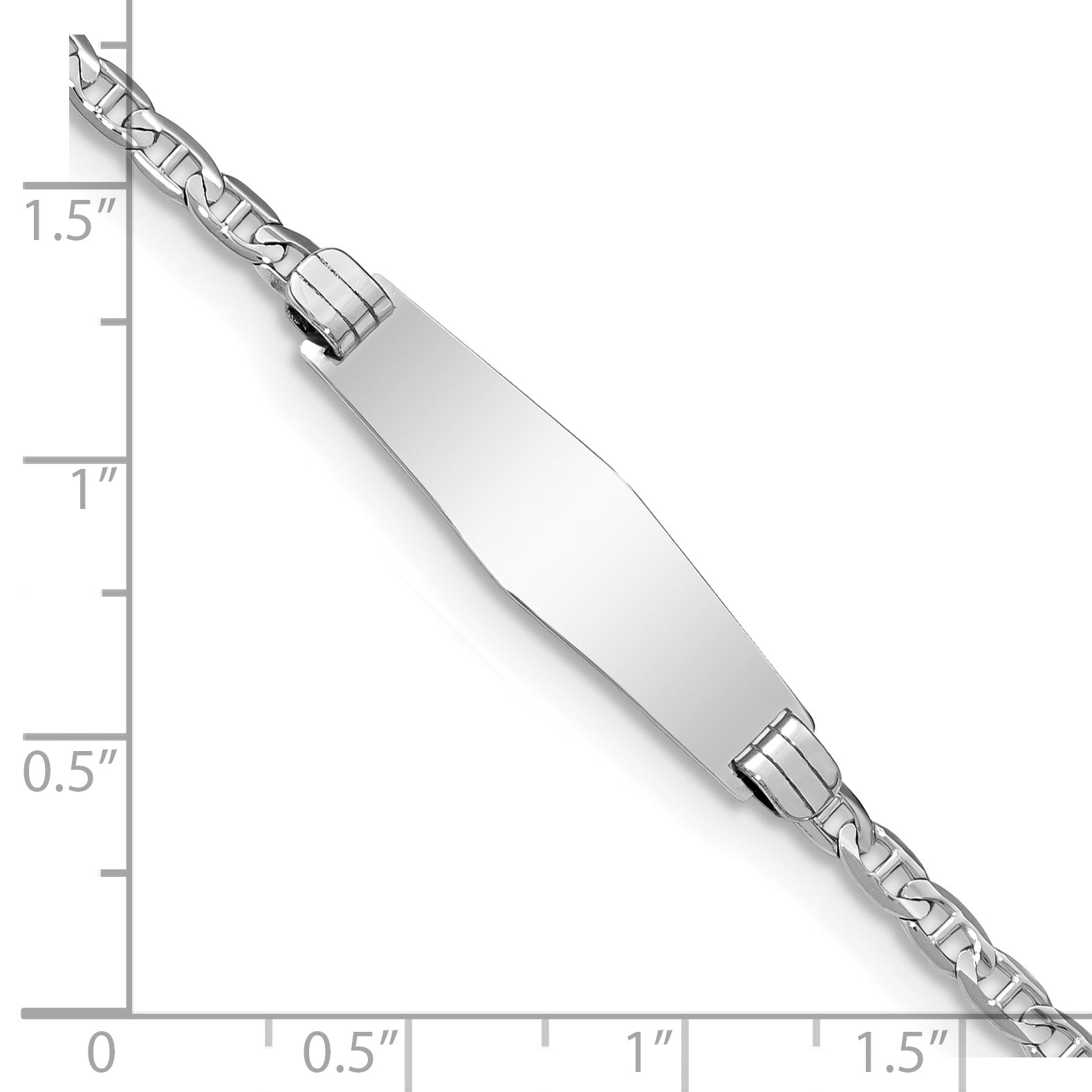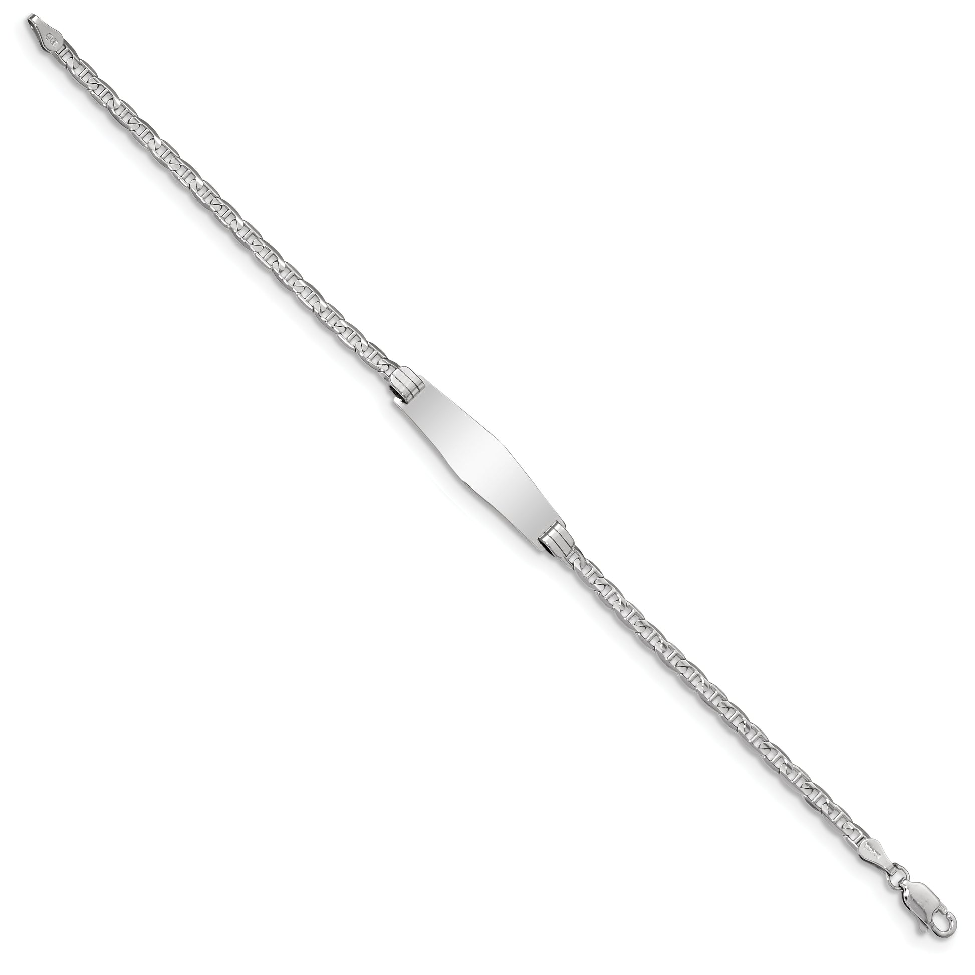 The 7 Inch 14K White Gold Semi-Solid Soft Diamond Shape Anchor Link ID Bracelet epitomizes elegance and style. Crafted from 14K white gold, this polished bracelet features a semi-solid anchor link chain that stretches to 7 inches in length and 2.5 mm in width. The centerpiece showcases a sleek ID plate that is engravable for a personal touch. Highlighting its unique design, the bracelet includes a single, brilliantly set stone measuring 5.75 x 3.2 mm. Finished with a secure lobster clasp, the 7 Inch 14K White Gold Semi-Solid Soft Diamond Shape Anchor Link ID Bracelet is a timeless addition to any wardrobe for both men and women.