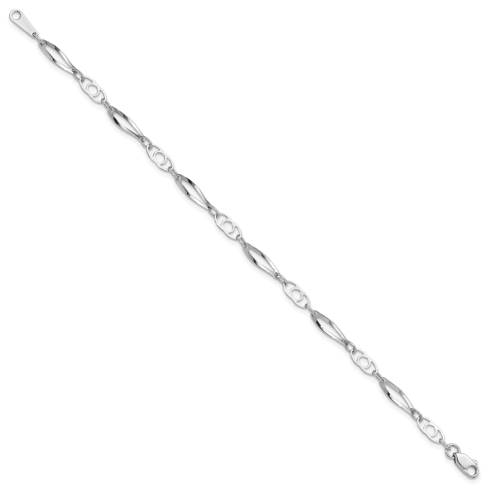 The 7-Inch 14K White Gold Polished Fancy Link Bracelet is a dazzling piece designed to elevate any look. Crafted meticulously from 14K white gold, this bracelet features a polished finish, adding a touch of sophistication. The bracelet measures 7 inches in length and 4 mm in width, making it a perfect fit for most wrists. Its semi-solid form ensures both durability and comfort. A lobster clasp secures it firmly, so you can wear it with confidence. The 7-Inch 14K White Gold Polished Fancy Link Bracelet embodies elegance and timeless style, making it a must-have accessory.