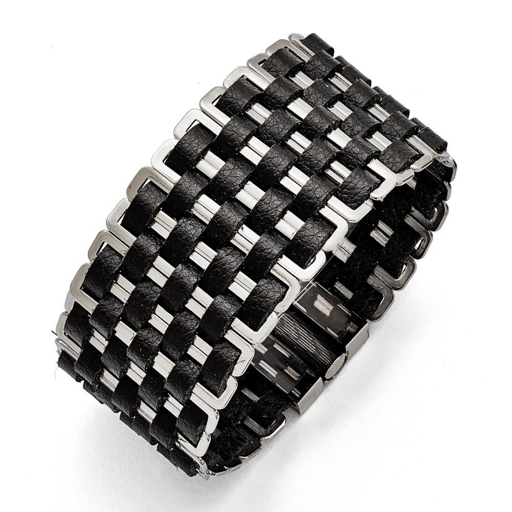 The 7 Inch Stainless Steel Polished Woven Black Leather Bracelet offers a chic and modern touch to your accessory collection. The sleek, polished stainless steel harmonizes perfectly with the braided black leather, creating a bold yet elegant look. At 7 inches long, this bracelet wraps comfortably around the wrist, secured with a reliable magnetic clasp. Its 35mm width adds just the right amount of presence, making it an ideal choice for any occasion. This contemporary bracelet blends durability with style, perfect for the fashion-forward woman looking to make a statement.