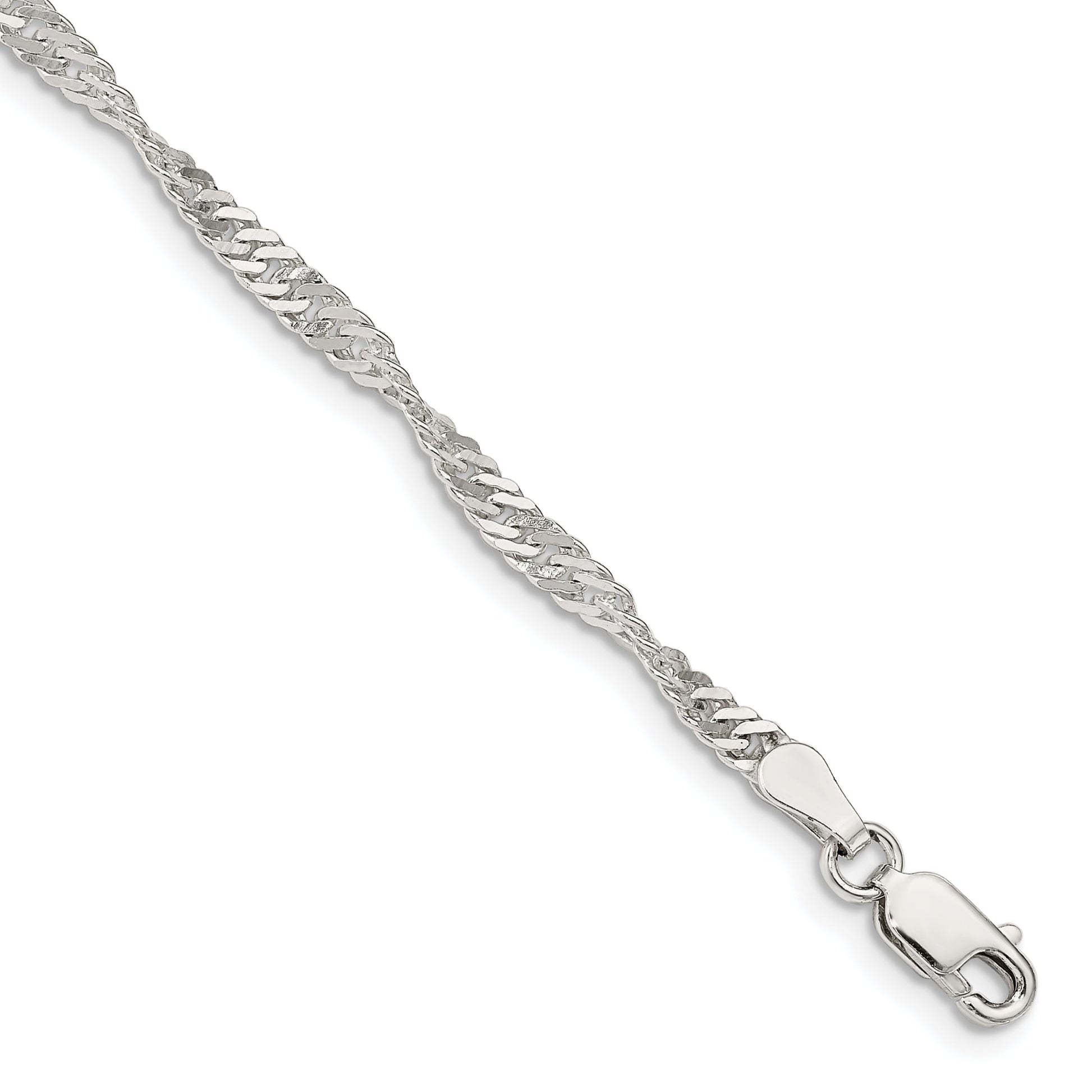 The 7 Inch Sterling Silver 3mm Singapore Chain Bracelet dazzles with its polished shine. Crafted from high-quality 925 sterling silver, this piece offers both durability and luster. Its unique Singapore chain design adds an intricate texture, making it a standout accessory for any occasion. At 7 inches long and 3 mm wide, it fits comfortably and elegantly on the wrist. The solid construction ensures lasting quality, while the lobster clasp secures it firmly in place. Elevate your jewelry collection with the stunning 7 Inch Sterling Silver 3mm Singapore Chain Bracelet.