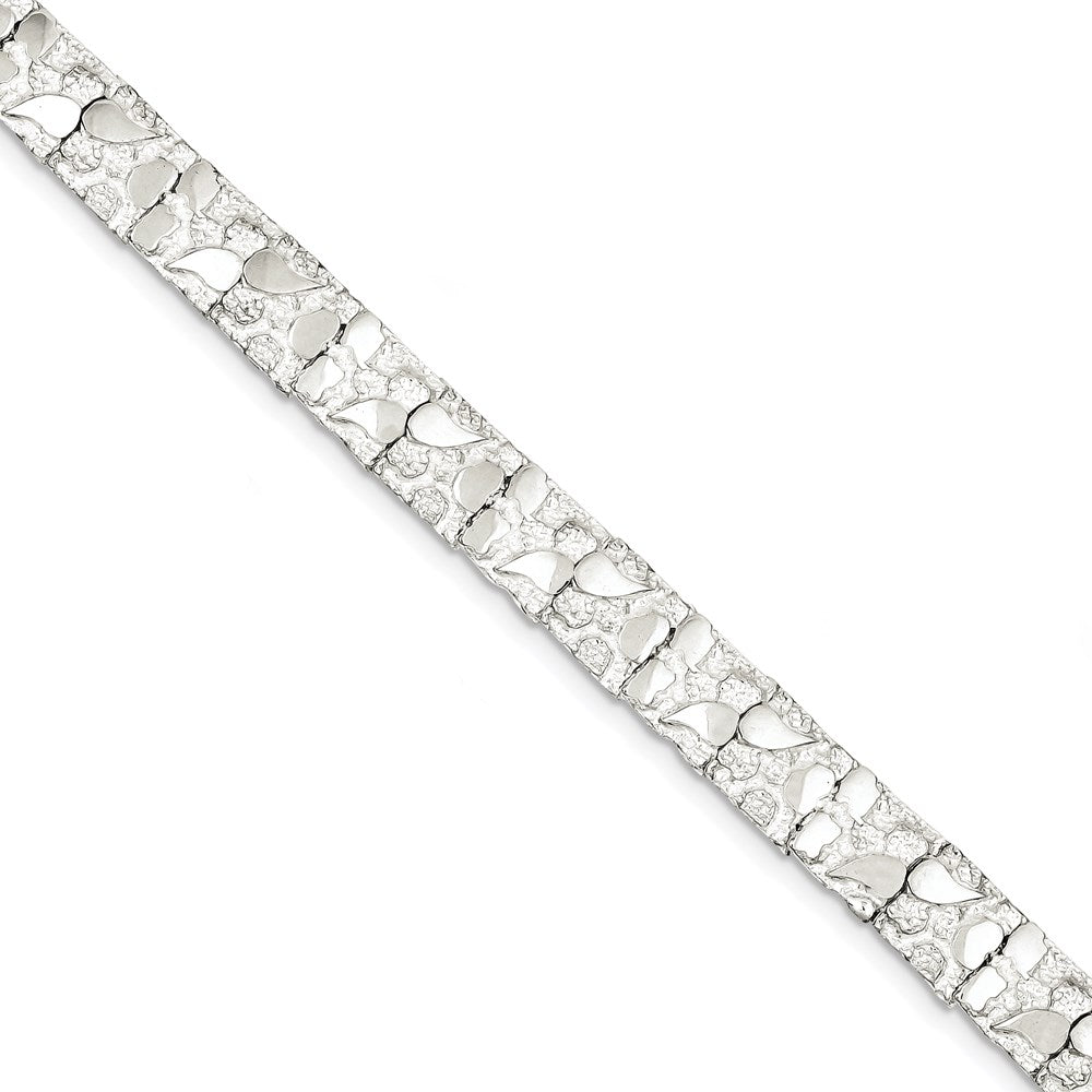 The 7 Inch Sterling Silver 9mm Nugget Bracelet is a stylish piece that brings both elegance and charm to your wrist. Crafted from high-quality 925 sterling silver, this bracelet gleams with a polished finish. Its solid cast design ensures durability and a luxurious feel. With a classic 7-inch link chain, it gracefully wraps around your wrist, secured by a reliable fold-over clasp. The substantial 9mm width adds a bold touch, making it an ideal choice for both casual and formal occasions. Elevate your accessory game with the timeless allure of this striking Sterling Silver Nugget Bracelet.