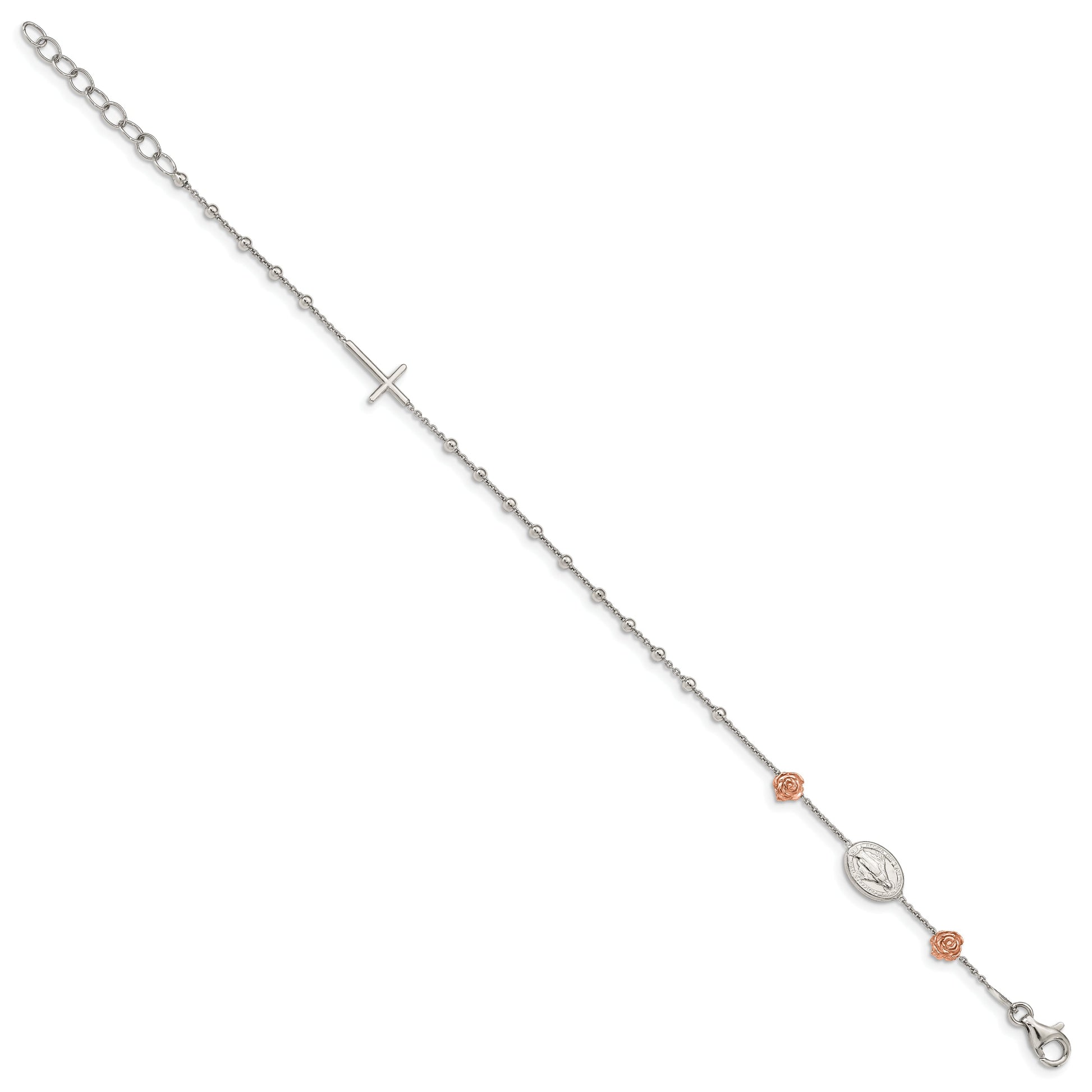 Introducing the 7 Inch Sterling Silver Rhodium-Plated Rose-Tone Roses with Cross Bracelet—a perfect blend of elegance and style. Crafted from 925 sterling silver, this bracelet shines with a polished, rhodium-plated finish. Its charming cable chain design measures 7 inches, with an additional 1-inch extender for adjustable comfort. Adorned with delicate rose-tone roses and a cross motif, this bracelet adds grace to any wrist. The lobster clasp ensures a secure fit and gorgeous look, making it a cherished accessory for any occasion. Discover the beauty of the 7 Inch Sterling Silver Rhodium-Plated Rose-Tone Roses with Cross Bracelet, a must-have in your collection.