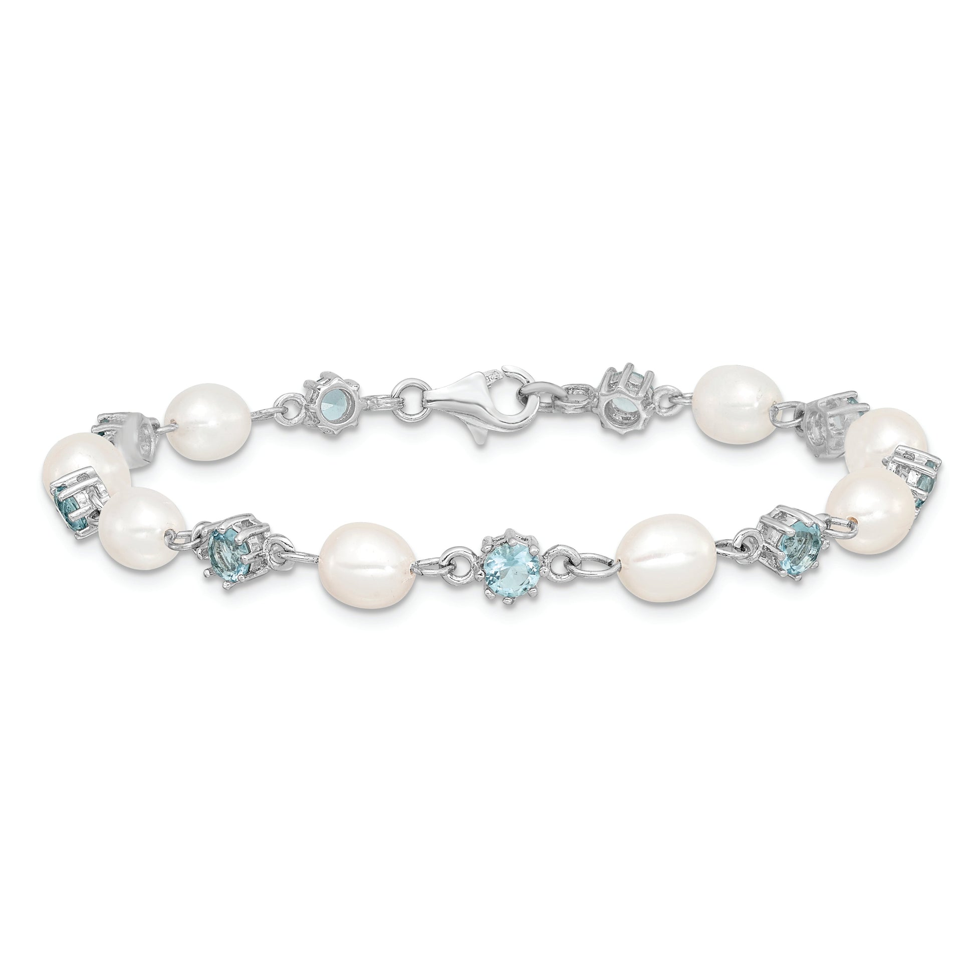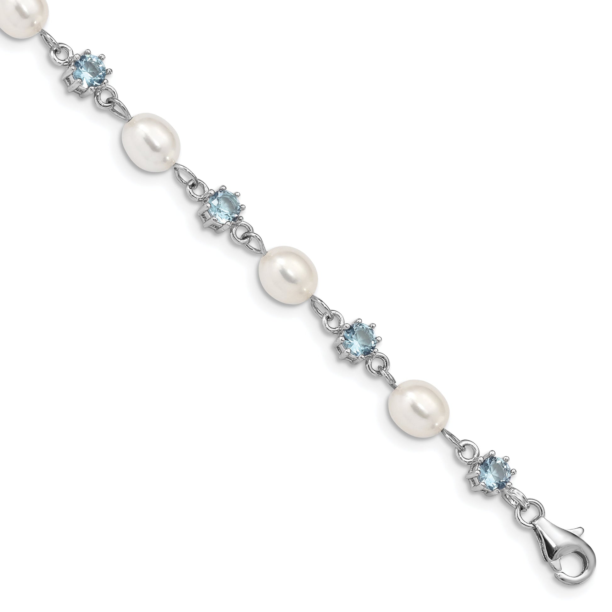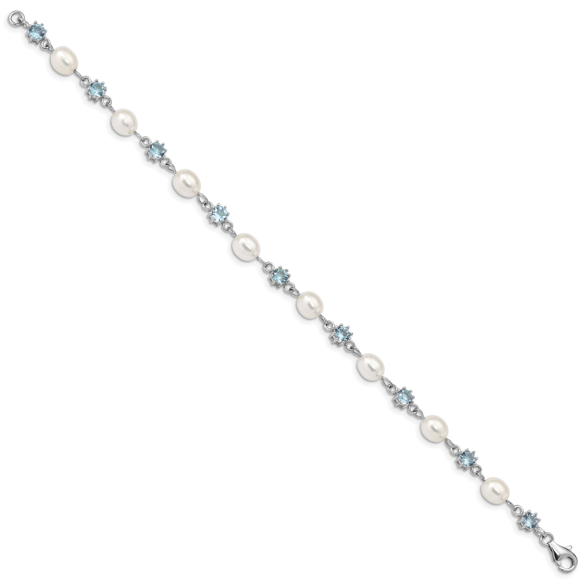 Elevate your wrist game with our stunning 7-Inch Sterling Silver Rhodium Blue CZ FW Cultured Pearl Bracelet. Expertly crafted from high-quality 925 sterling silver, this polished beauty shimmers with elegance. Its sparkling blue cubic zirconia stones provide a vibrant contrast to the lustrous white freshwater cultured pearls. With a secure lobster clasp, this bracelet offers both style and peace of mind. The rhodium plating ensures long-lasting shine and resistance to tarnish. The 6.5mm chain wraps comfortably around the wrist, making this bracelet a perfect match for any occasion. Embrace timeless refinement with our 7-Inch Sterling Silver Rhodium Blue CZ FW Cultured Pearl Bracelet.