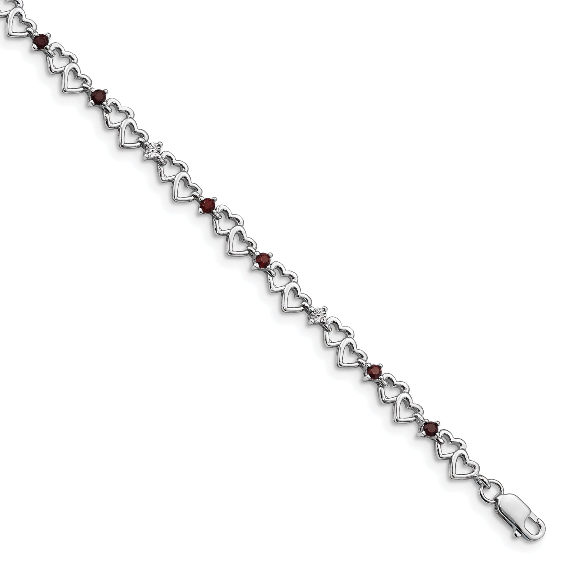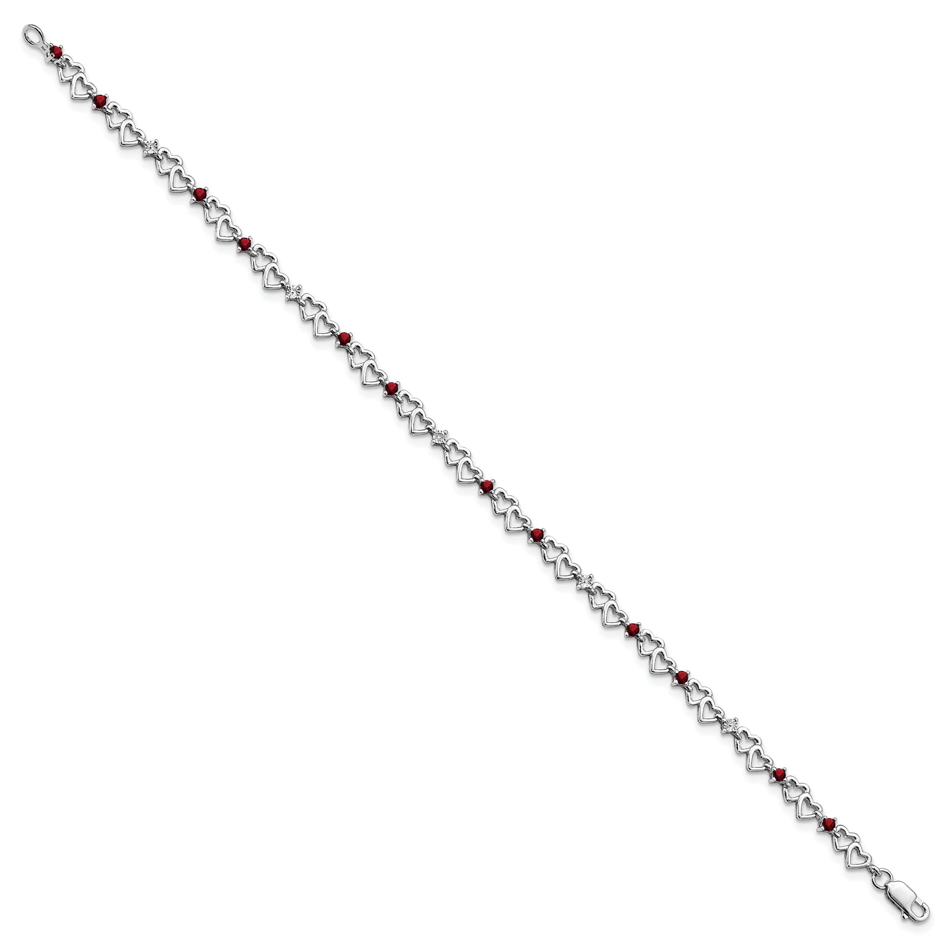 The 7 Inch Sterling Silver Rhodium-Plated Garnet & Diamond Bracelet is an artful display of elegance. Crafted from 925 sterling silver, this polished bracelet boasts a striking collection of twelve natural red garnets and a single, dazzling diamond. Set in a secure prong setting, these gemstones sparkle with every glance. Each garnet, with a weight of 0.564 carats, pairs beautifully with the brilliant 0.005 carat diamond. The rhodium plating ensures long-lasting shine and resistance to tarnish. With an easy-to-use lobster clasp, this 7-inch bracelet offers both beauty and practicality. The 7 Inch Sterling Silver Rhodium-Plated Garnet & Diamond Bracelet is an exquisite piece for any occasion.