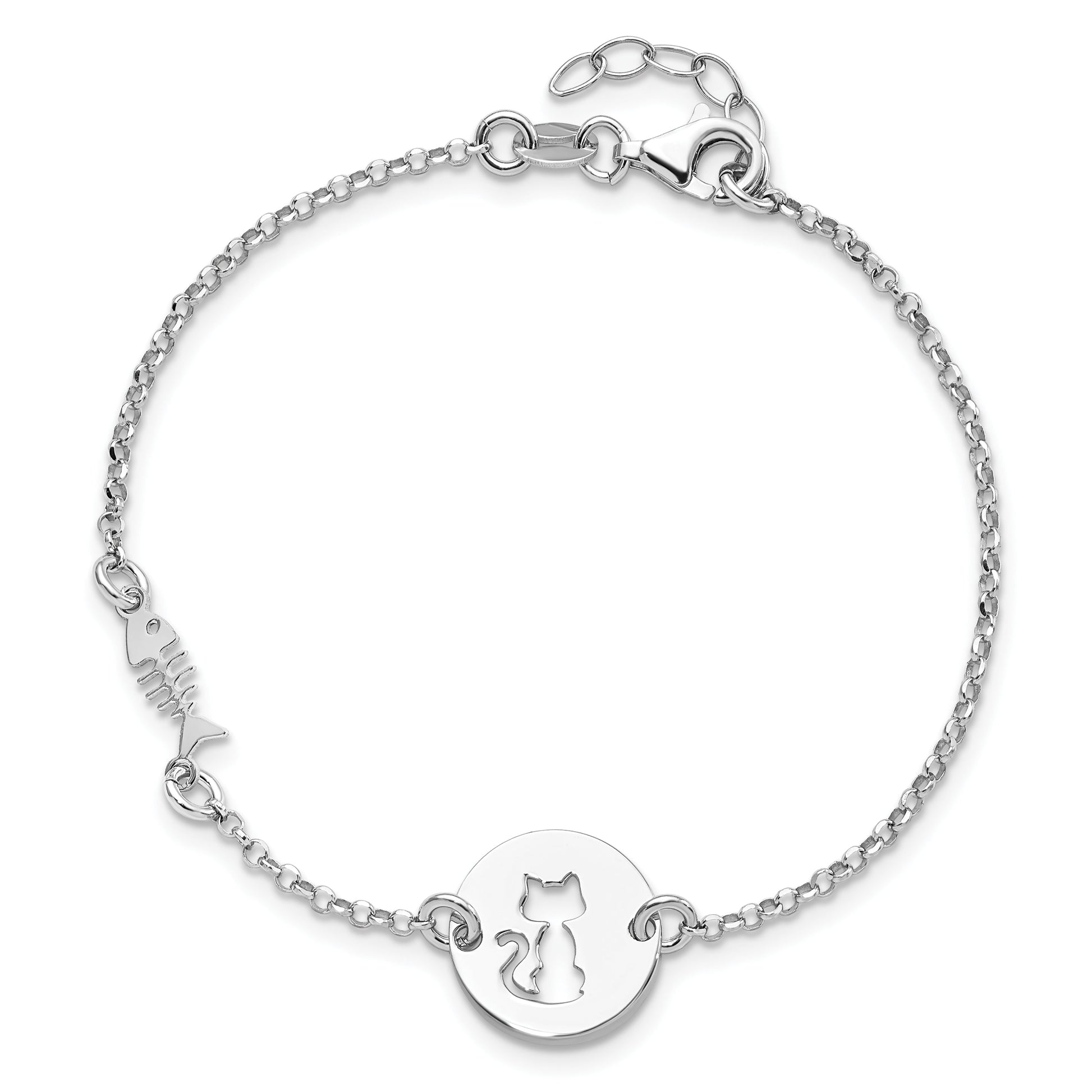 The 7 Inch Sterling Silver Rhodium-Plated Kitty and Fish Bracelet offers a playful touch to any outfit while maintaining elegance. Crafted from 925 sterling silver, this bracelet shines with a polished finish. The delicate cable chain is 7 inches long, including a 0.5-inch extender for the perfect fit. The charming kitty and fish motif measures about 12.95 mm in both length and width, capturing a whimsical vibe. With a secure lobster clasp for easy wear, this bracelet is a lovely gift for any woman who loves cats. Add this adorable piece to your collection today.