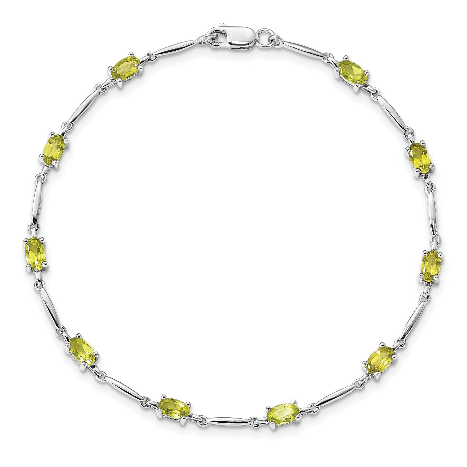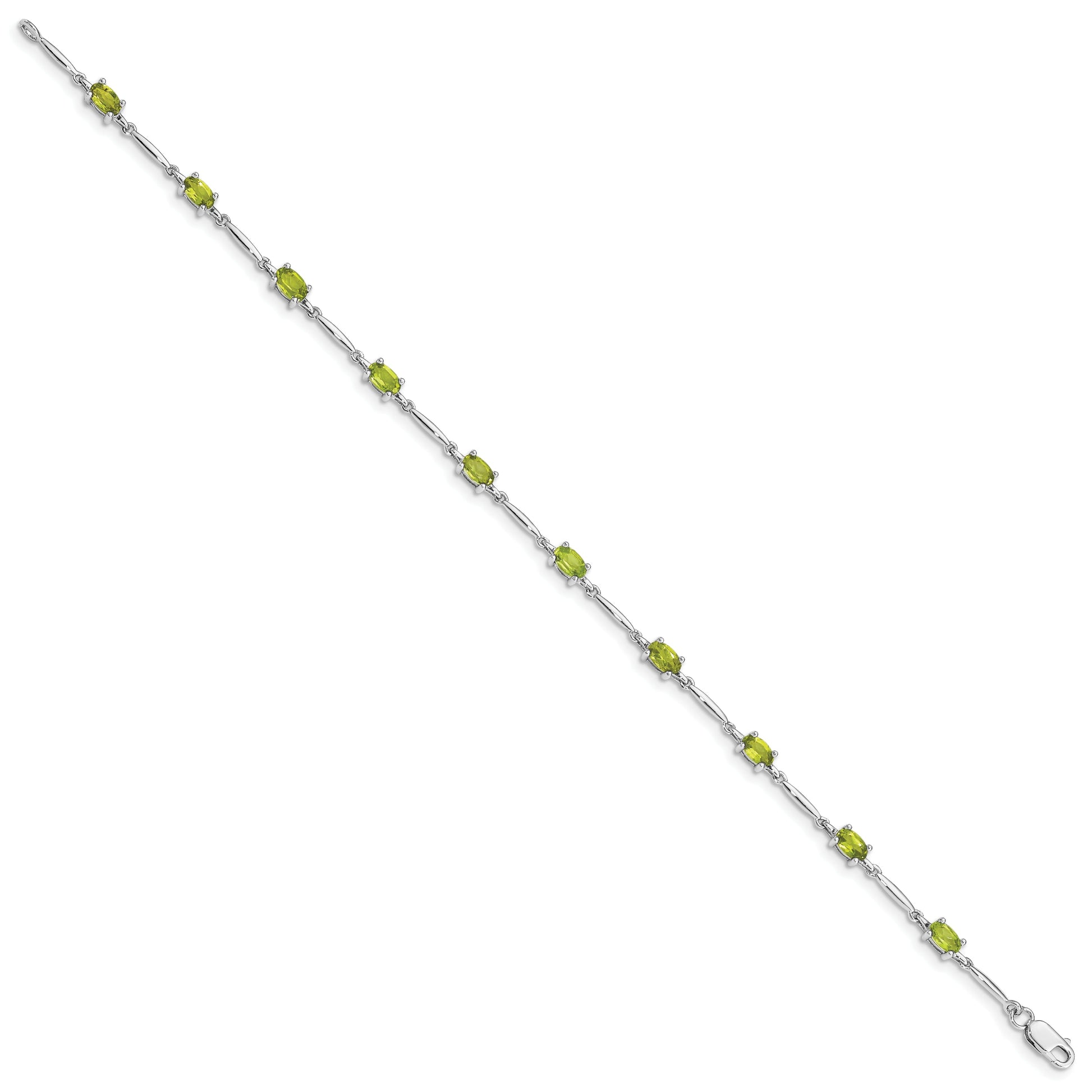 Fall in love with the 7 Inch Sterling Silver Rhodium-Plated Peridot Bracelet, a true statement piece for any collection. Crafted from pure 925 sterling silver, this bracelet shines with a polished rhodium finish. Ten dazzling natural peridot stones, weighing a total of 2.55 carats, adorn this piece, showcasing a vibrant green color that captures attention. Each stone is skillfully prong-set for a secure fit. The bracelet, designed for women, measures 7 inches in length and 3 mm in width, closing with a reliable lobster clasp. The 7 Inch Sterling Silver Rhodium-Plated Peridot Bracelet makes a perfect gift for those born in August or anyone who loves timeless elegance.