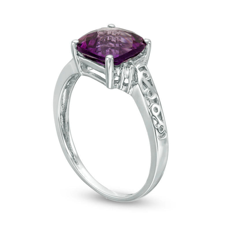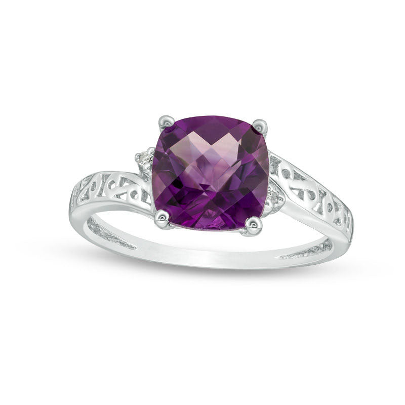 8.0mm Cushion-Cut Amethyst and Natural Diamond Accent Bypass Scroll Shank Ring in Solid 10K White Gold