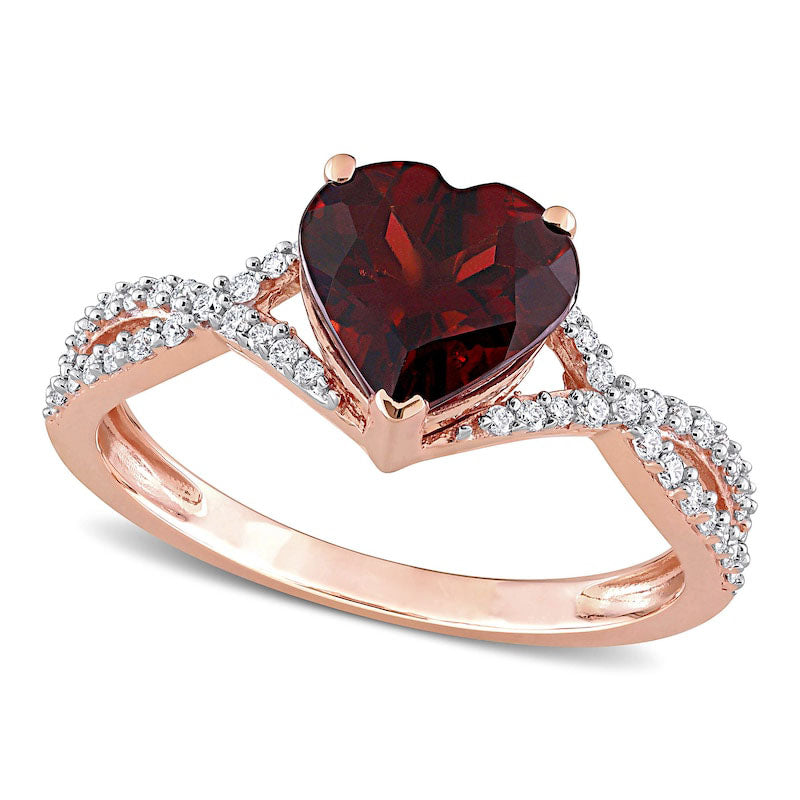 8.0mm Heart-Shaped Garnet and 0.20 CT. T.W. Natural Diamond Twist Split Shank Ring in Solid 14K Rose Gold