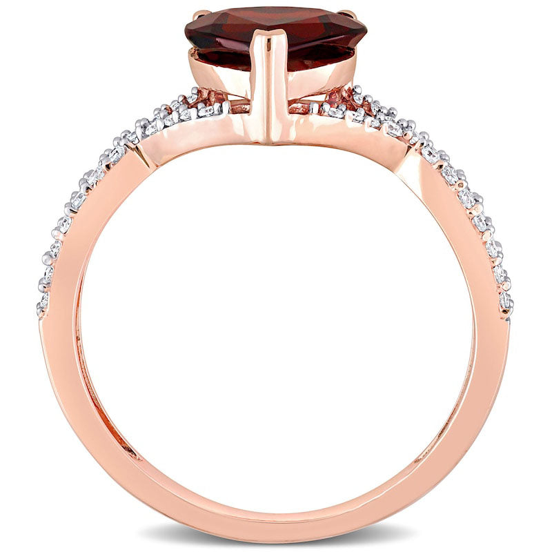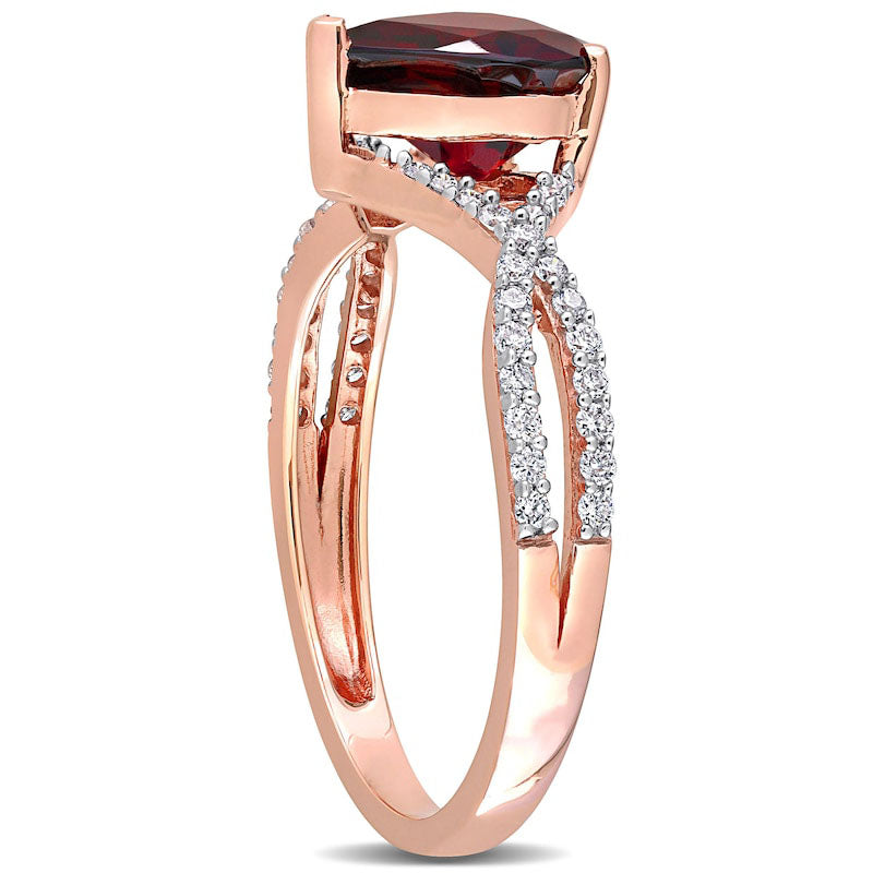 Fall in love with the charming elegance of this stunning gemstone and diamond ring. Skillfully crafted in 14K rose gold, this ring boasts an exquisite 8.0mm heart-shaped garnet that exudes regal red allure. The split shank dazzles with diamonds that shimmer along twisted ribbons, adding a touch of sophistication to the design. With a total diamond weight of 1/5 ct. and a brilliant shine, this choice is sure to complement your unique romantic style. Please note that this ring is available in limited sizes.
