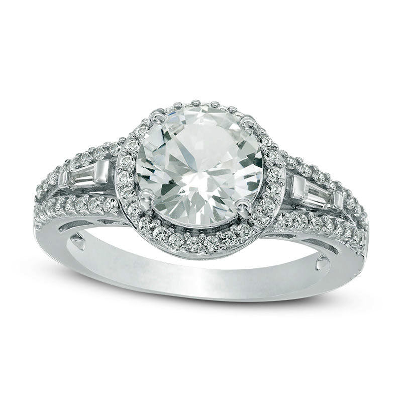 This engagement ring is the perfect way to express your love for her. Made from sterling silver, it features a dazzling 8.0mm lab-created white sapphire at the center, surrounded by smaller sapphires that add to the overall sparkle. The tapered baguette-cut sapphires on either side of the centerpiece draw attention to its radiance. To finish off the design, round created sapphires line the shank. A symbol of your devotion, this gorgeous ring will leave her feeling cherished. It is custom-fit to her ring size, and please note that sterling silver rings cannot be resized.