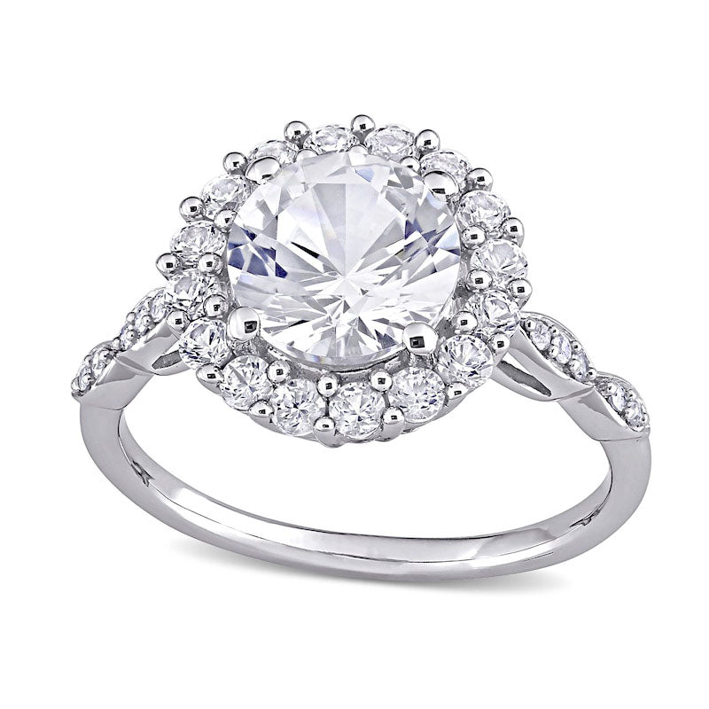 Surprise your beloved with a stunning symbol of your love, bound to take her breath away. This exceptional engagement ring boasts an Art Deco design, crafted from lustrous 10K white gold. The ring highlights a radiant 8.0mm white lab-created sapphire encircled by a delicate halo of petite lab-created sapphires. The shank features trios of glittering diamonds carefully arranged in striking marquise shapes. With an alluring total of 1/20 ct. t.w. of diamonds and a glossy polished finish, this engagement ring is the representation of the love that you share.