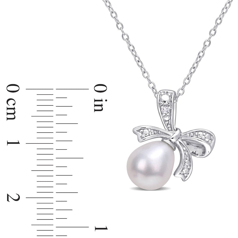 8.5-9.0mm Oval Cultured Freshwater Pearl and Natural Diamond Accent Bow Pendant in Sterling Silver