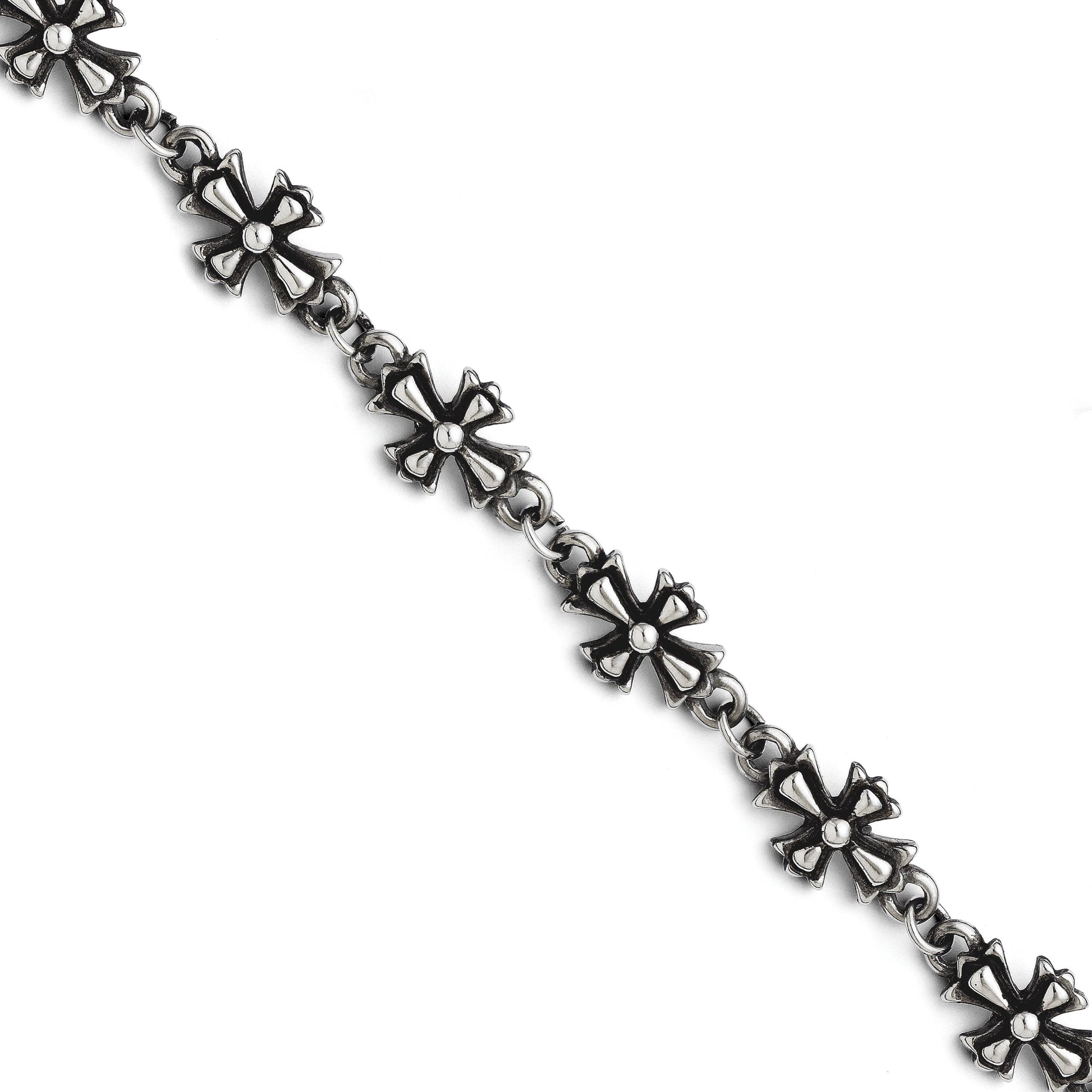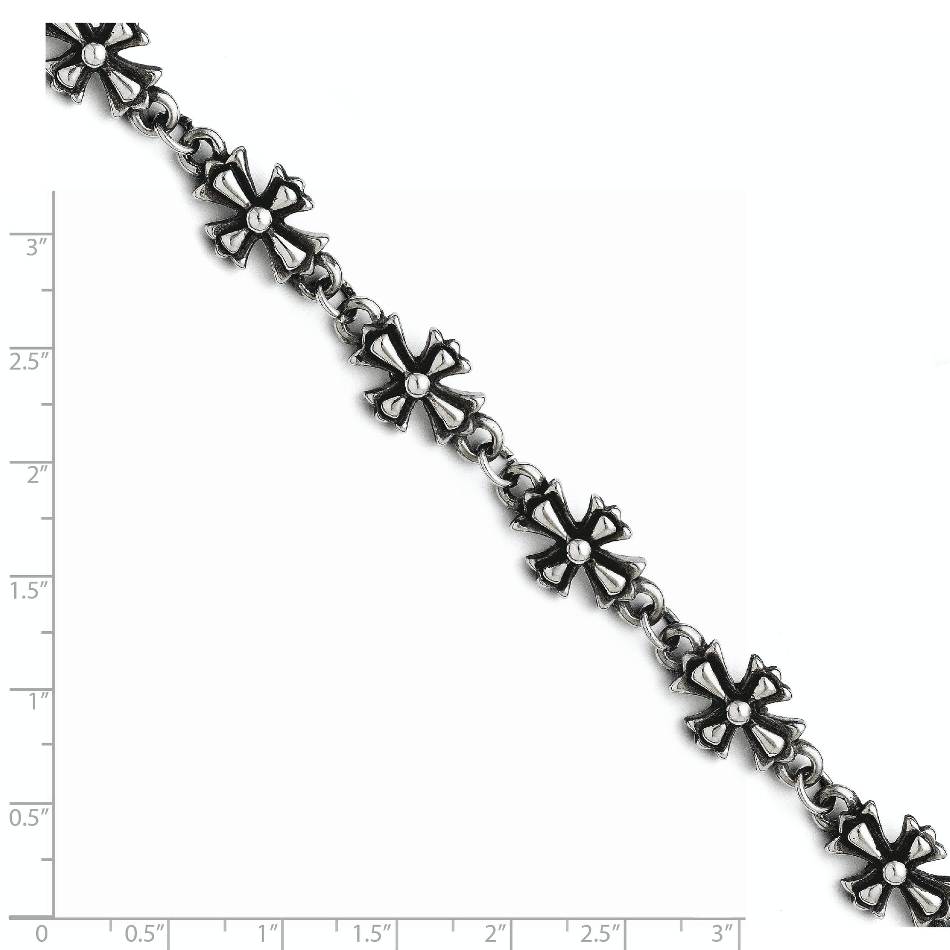Elevate your style with the 8.5 Inch Stainless Steel Antiqued Crosses Bracelet. Crafted from durable stainless steel, this bracelet combines polished and antiqued finishes for a striking contrast. The 8.5-inch chain features intricate crosses for a timeless look. With a 12 mm width, it makes a bold statement on any wrist. The lobster clasp ensures a secure fit, bringing both form and function together. Designed for men who appreciate rugged elegance, this bracelet withstands daily wear while enhancing any outfit. Add character to your collection with the 8.5 Inch Stainless Steel Antiqued Crosses Bracelet.
