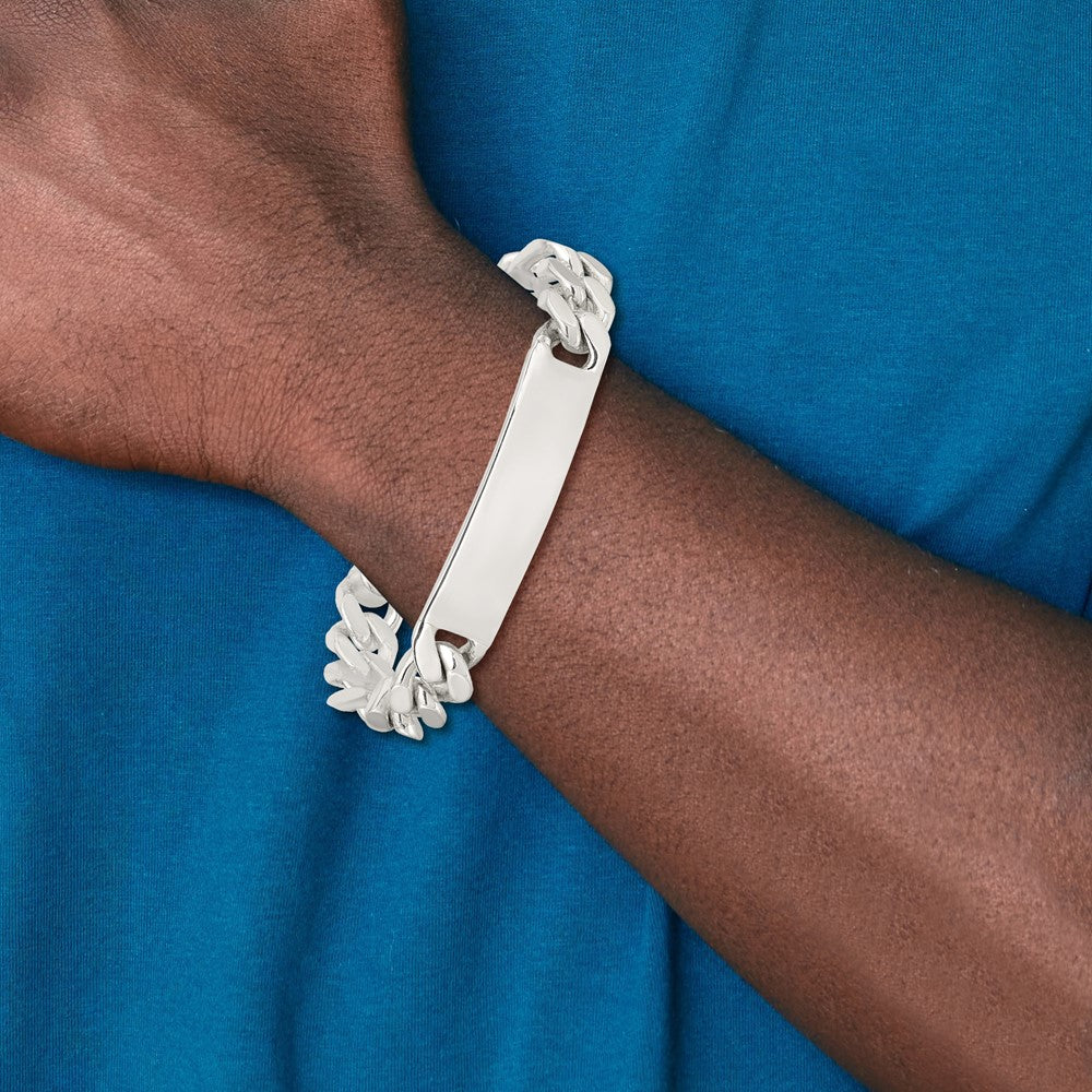 Elevate your style with the 8.5 Inch Sterling Silver Polished Engraveable Figaro Link ID Bracelet. Crafted from high-quality 925 sterling silver, this bracelet boasts a polished finish that gleams. Its 8.5-inch length and 10 mm width offer a substantial feel, while the engraved ID plate adds a personalized touch. The classic Figaro link design gives it a timeless appeal, perfect for any occasion. This solid piece is secured with a lobster clasp, ensuring durability and ease of wear. Make a statement with this stunning men's 8.5 Inch Sterling Silver ID Bracelet.