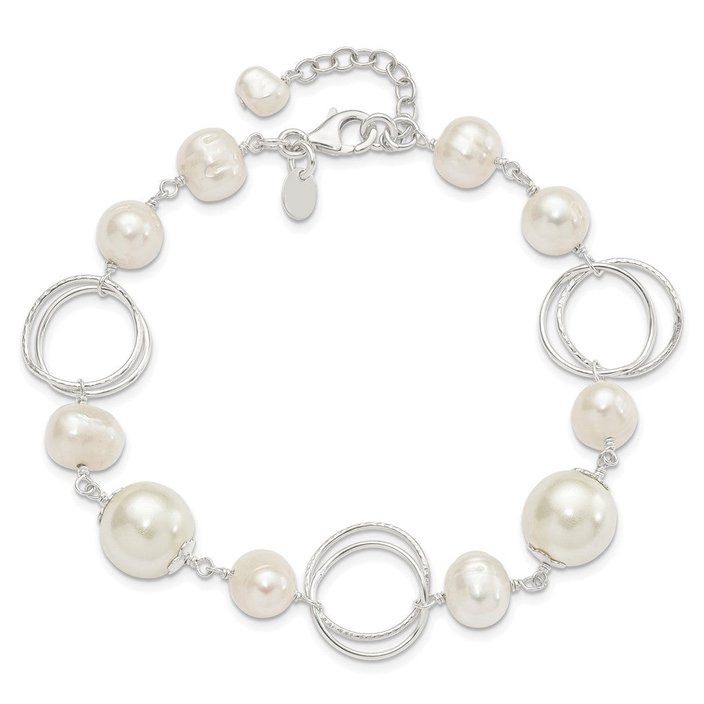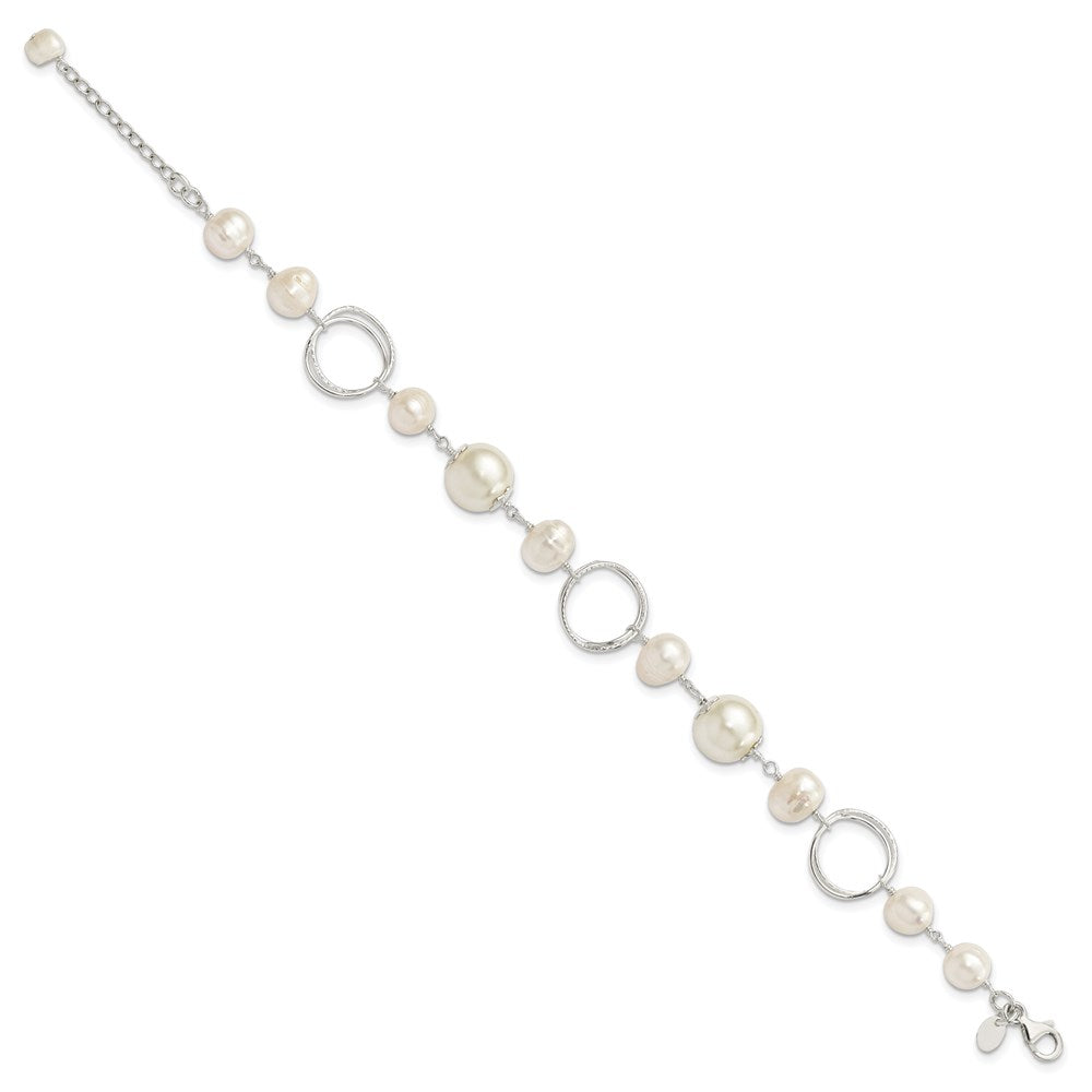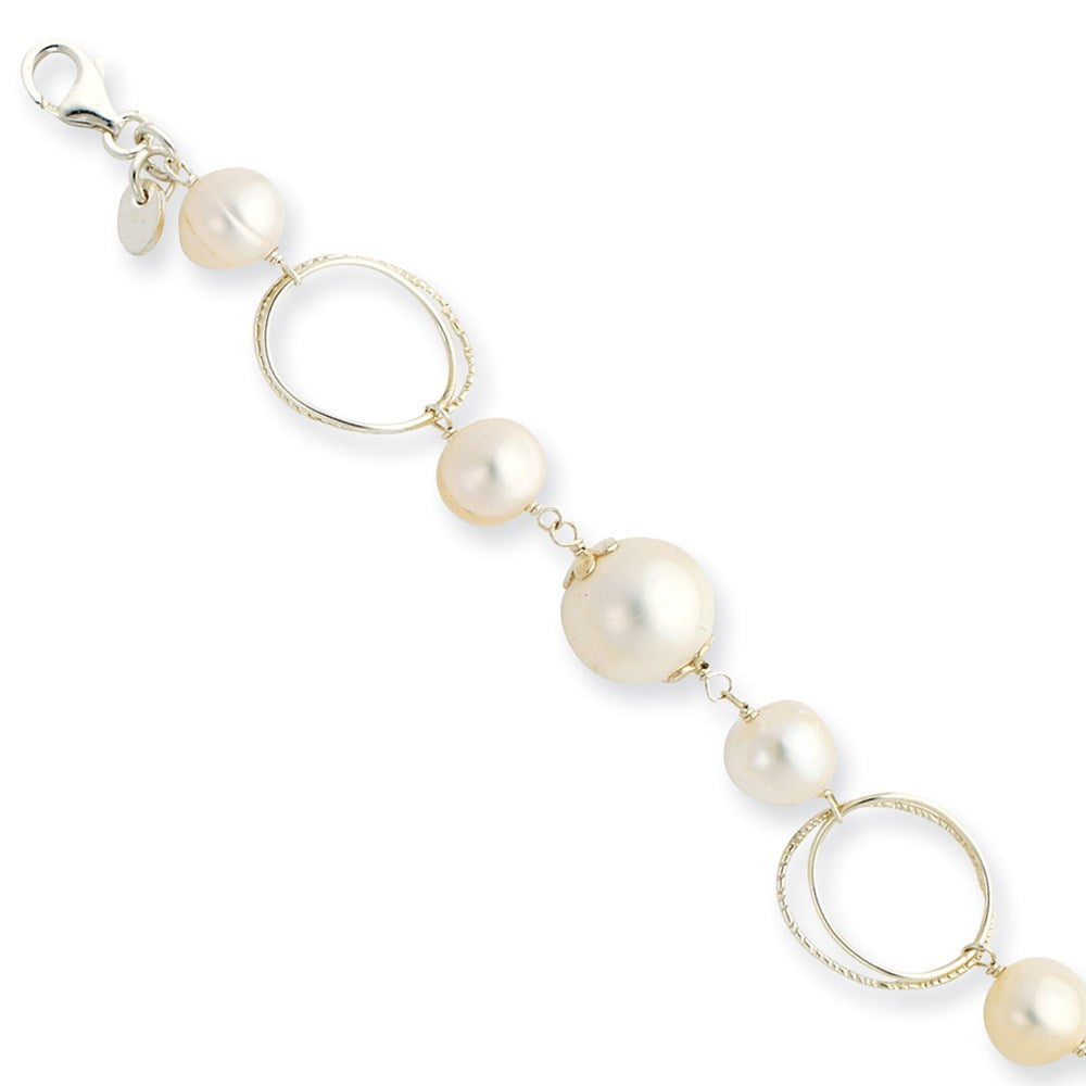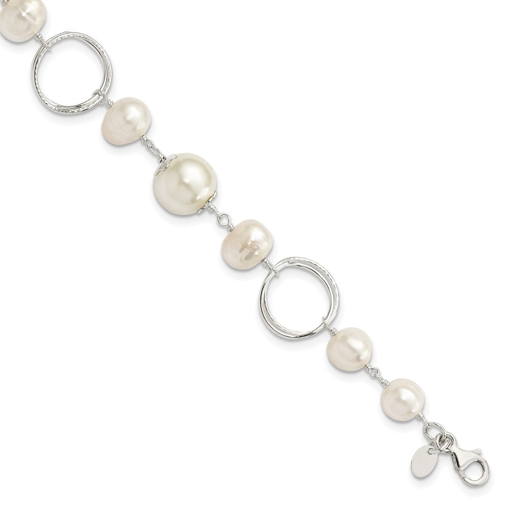 The 8.5-Inch Sterling Silver Freshwater Cultured Pearl Bracelet is a striking piece that blends elegance with modern flair. Crafted from sterling silver, it showcases polished, white, cultured pearls with an intriguing irregular shape, each ranging from 7 to 13 mm in size. This bracelet offers a sophisticated sparkle with 10 pearls, set along a fancy chain that measures 8.5 inches in length and 12 mm in width. The lobster clasp ensures a secure fit, while the textured finish adds depth. Ideal for any occasion, this bracelet epitomizes understated luxury with its sterling silver and pearl combination.