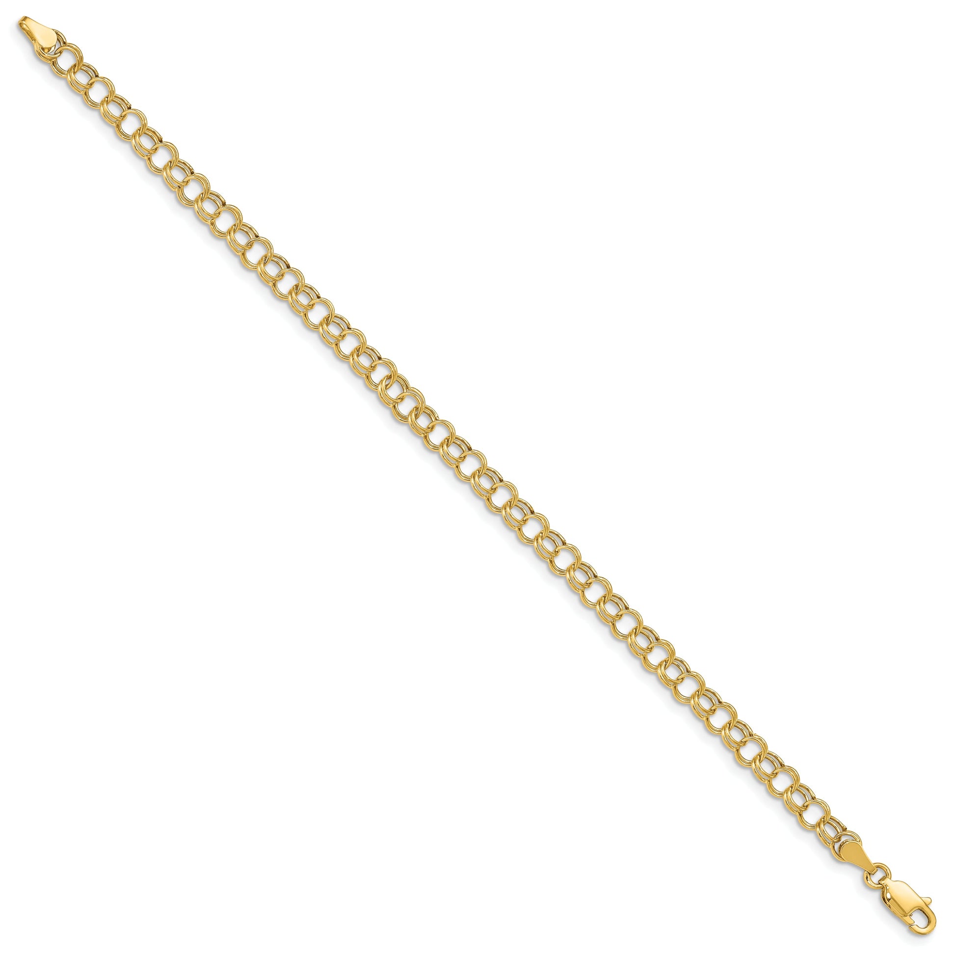 Discover the elegance of our 8 Inch 14K Hollow Double Link Charm Bracelet. Handcrafted from 14K yellow gold, this bracelet shines with a semi-solid design. It features double links which provide both strength and a striking visual appeal. Measuring a comfortable 8 inches in length with a 5 mm width, it is perfect for everyday wear or special occasions. The lobster clasp ensures a secure fit. Wear the 8 Inch 14K Hollow Double Link Charm Bracelet and add a touch of luxury to any outfit.