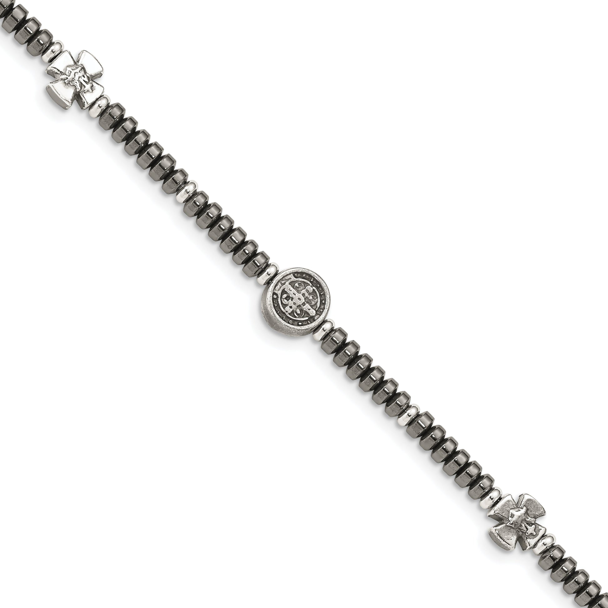 The 8 Inch Sterling Silver Antiqued Black Bead With Crosses Bracelet dazzles with its sophisticated and chic design. Crafted in 925 sterling silver, the bracelet features bold, antiqued black beads that beautifully highlight the intricate cross charms. Measuring 8 inches in length, this piece fits comfortably around the wrist with a stylish ball beaded chain. The clasp is a fancy lobster design, ensuring a secure fit. Each charm measures 7.8 mm, adding a distinct touch to the bracelet's character. This beaded treasure is more than just jewelry; it’s a statement of timeless elegance.