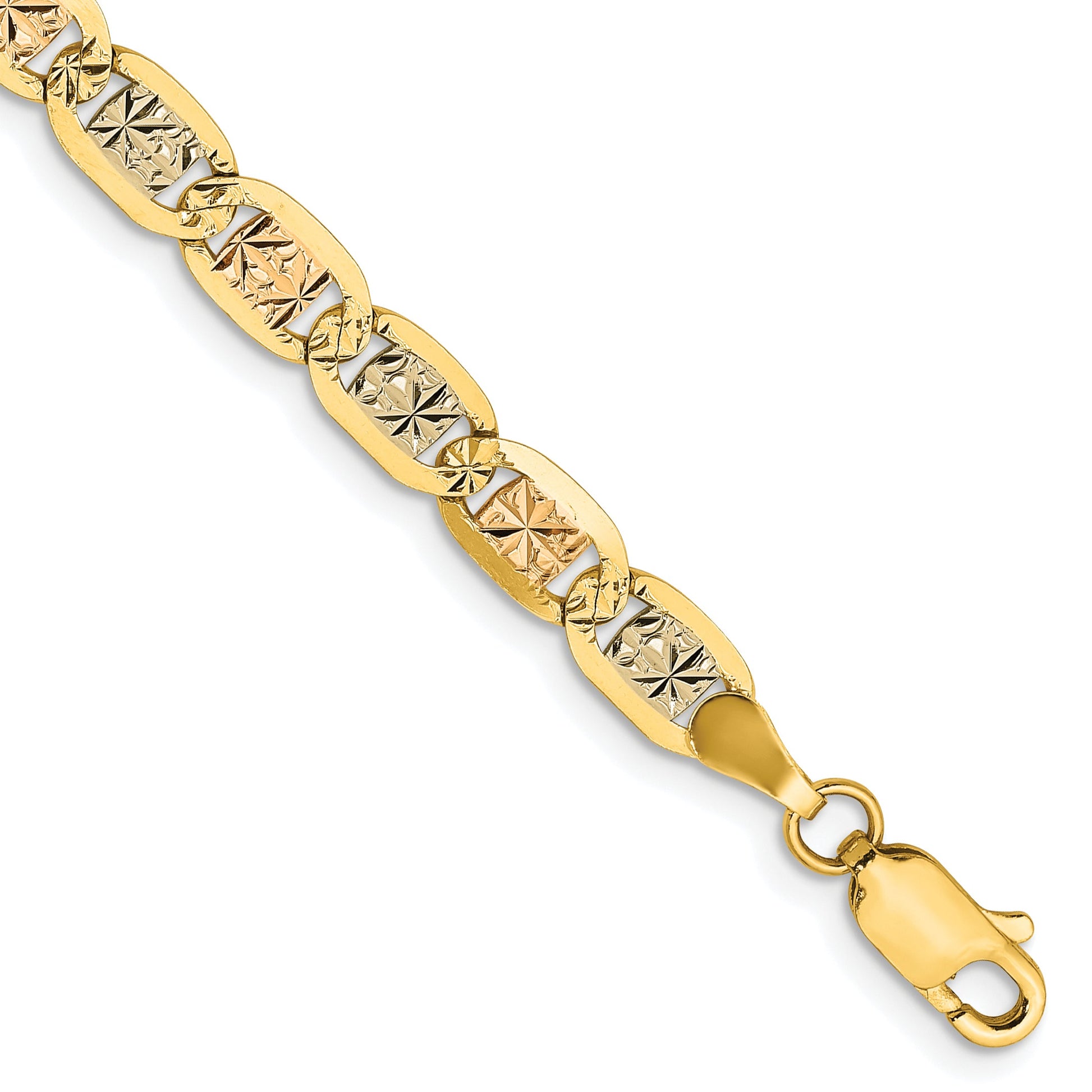 The 9 Inch 14K 4.65mm Tri-Color Gold Pavé Valentino Chain is a gorgeous addition to any jewelry collection. Crafted from quality 14K gold, this anklet glows with its polished finish and diamond-cut texture. The open link chain design and tri-color gold exude a unique charm, making it both stylish and timeless. The lobster clasp ensures a secure fit and adds a touch of elegance with its fine detailing. With a width of 4.65mm, this piece is perfect for those who value style and sophistication. Revel in the beauty of the 9 Inch 14K Tri-Color Gold Pavé Valentino Chain, a true statement piece.
