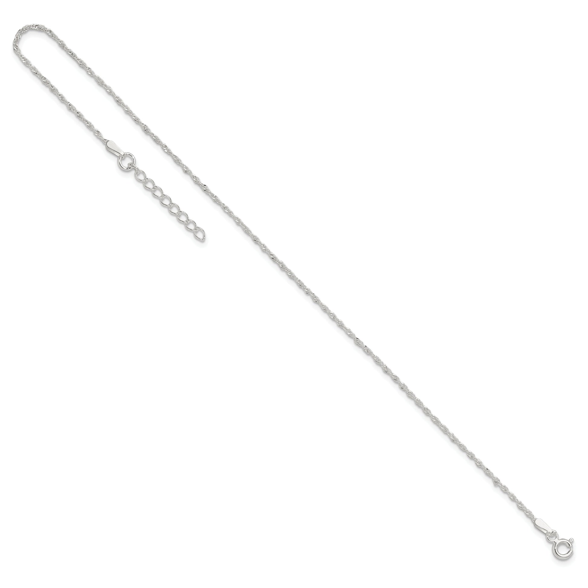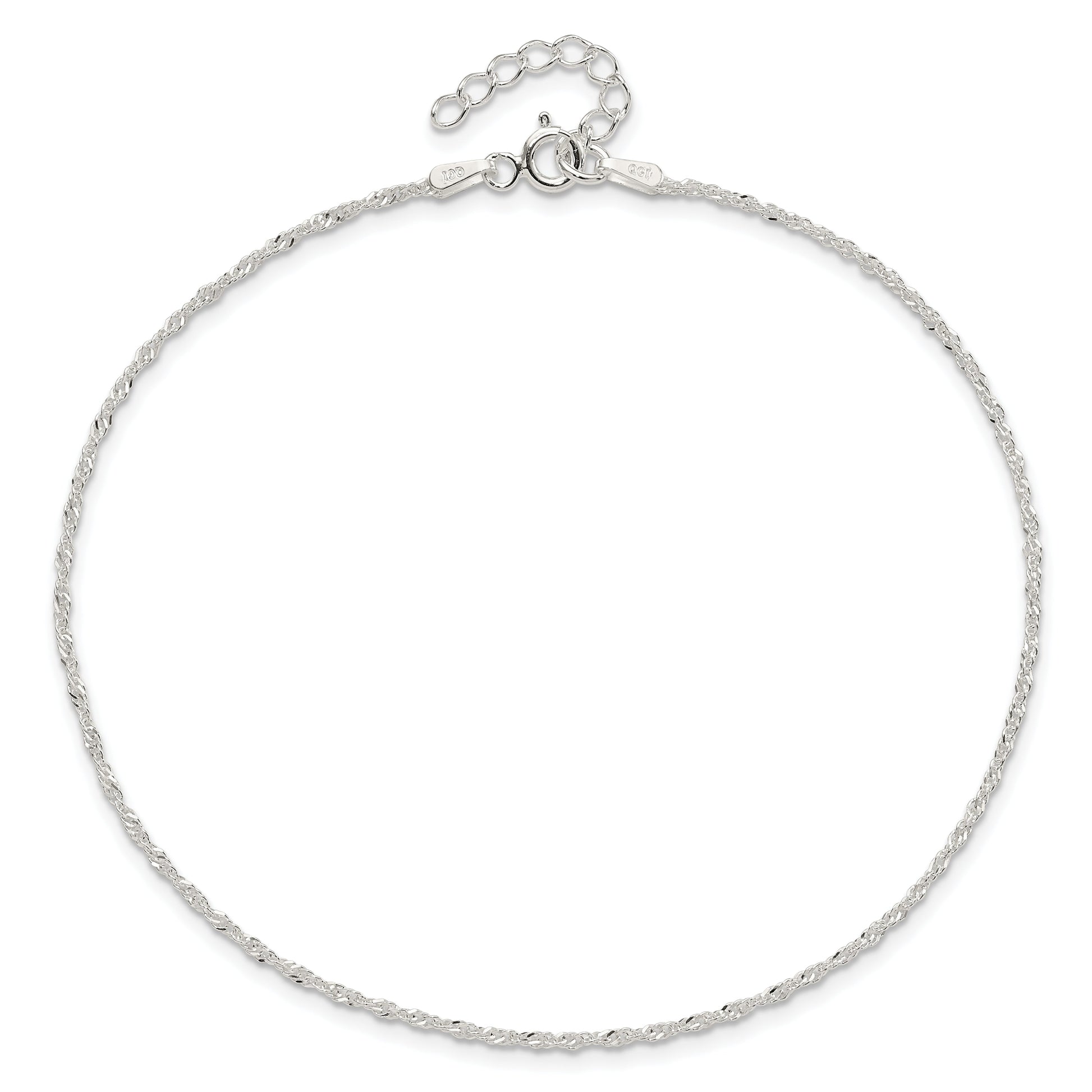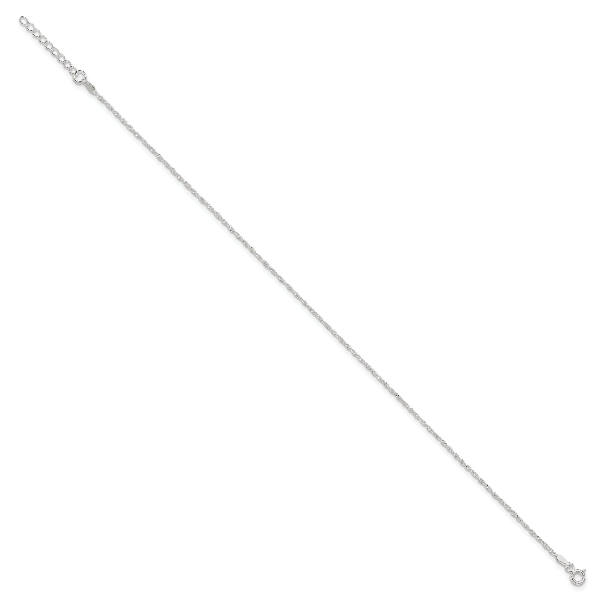Introducing the 9-Inch Sterling Silver 1.3mm Singapore Chain Anklet, a striking piece that makes any outfit pop. Crafted from pristine 925 sterling silver, this anklet boasts a polished finish, offering a shiny and sleek look. With a chain length of 9 inches and an extra 1-inch extender, it provides flexibility for the perfect fit. The classic Singapore chain design, at a dainty width of 1.3mm, enhances its timeless elegance. Its anti-tarnish coating ensures lasting beauty. The sturdy spring ring clasp offers secure wear. This anklet represents sophisticated style for the modern woman.