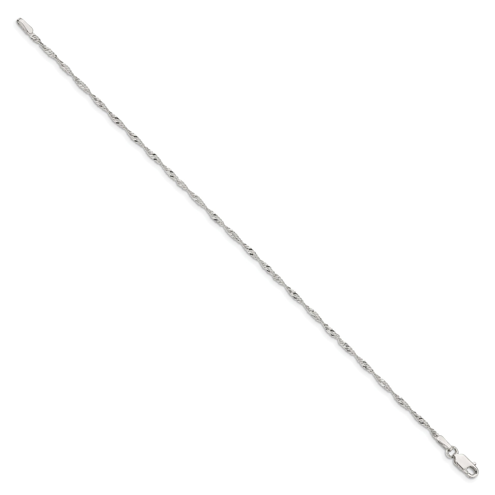 Discover elegance with this 9 Inch Sterling Silver 1.75mm Singapore Chain Anklet. Crafted from authentic 925 sterling silver, this anklet shines with a sleek polished finish. Measuring 9 inches in length, it gracefully hugs the ankle with its intricate Singapore chain design. The chain is sturdy yet delicate at 1.75mm wide, offering both durability and a touch of grace. A reliable lobster clasp ensures secure wear, perfect for daily elegance or special occasions. This women's anklet embodies both style and quality, making it a thoughtful gift or a chic addition to your jewelry collection.