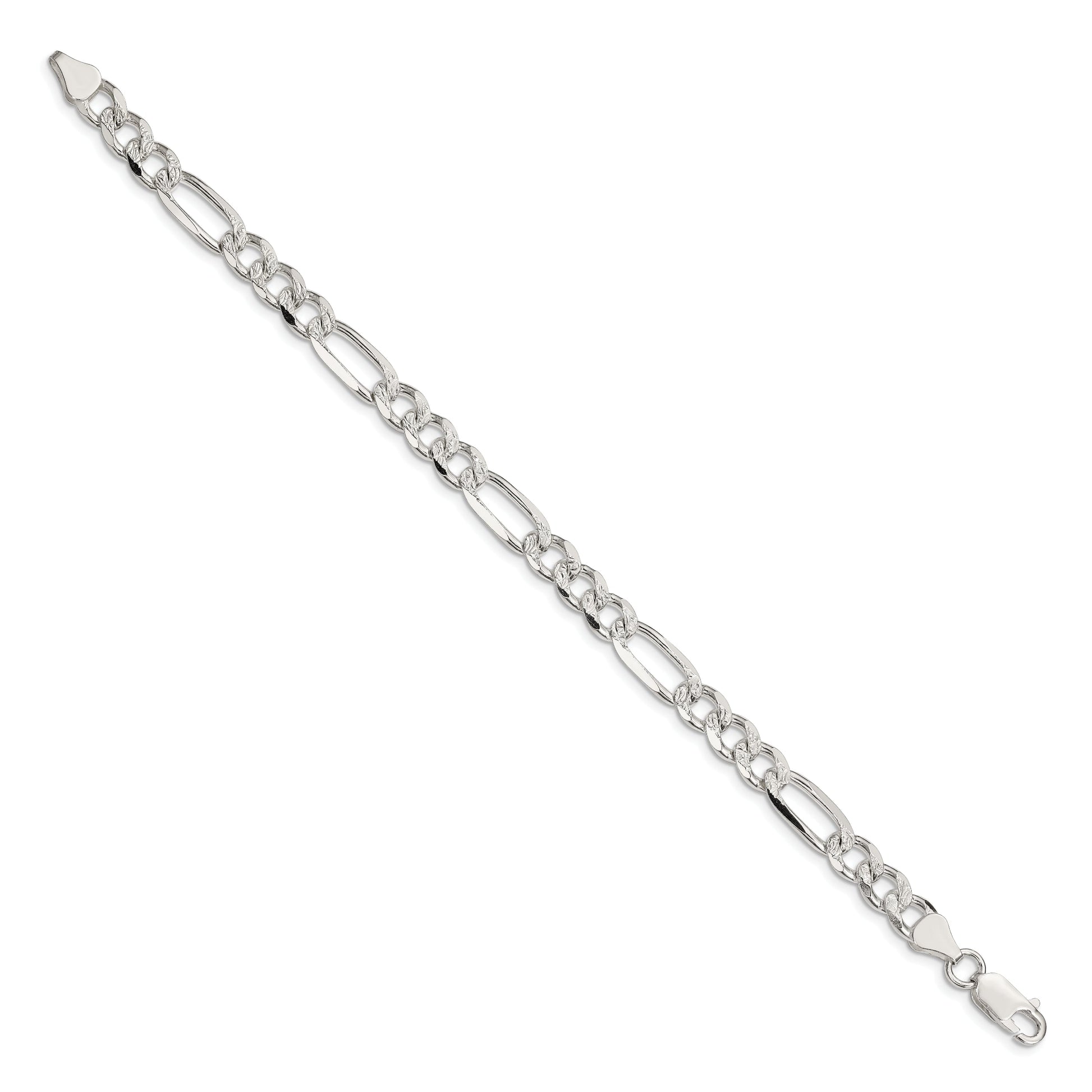 The 9 Inch Sterling Silver 7.25mm Pave Flat Figaro Chain is a stunning piece perfect for any occasion. Crafted from high-quality 925 sterling silver, this bracelet offers a polished finish and anti-tarnish coating, ensuring lasting shine. The classic Figaro chain is a unisex design that looks stylish on anyone, adding a touch of elegance to both casual and formal wear. Its solid construction and secure lobster clasp provide comfort and security. With its pave texture and flat profile, the 9 Inch Sterling Silver 7.25mm Pave Flat Figaro Chain makes a sophisticated statement.