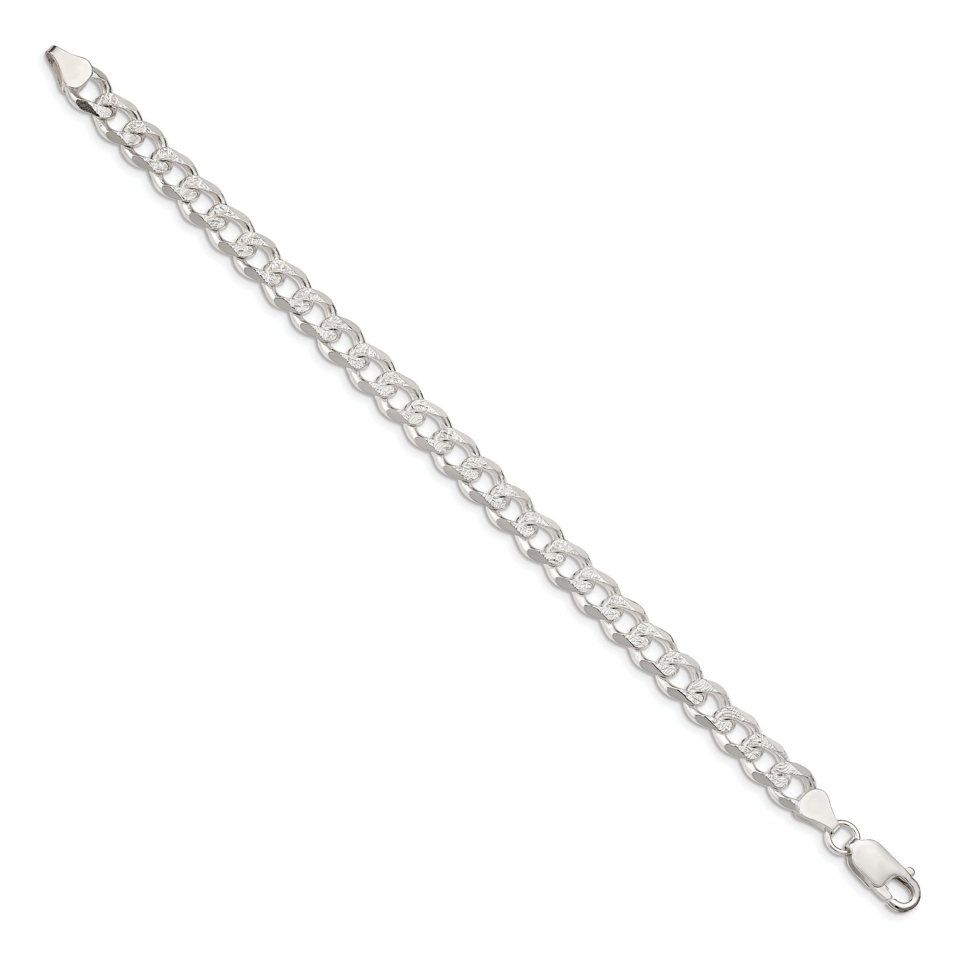 Introducing the 9-Inch Sterling Silver 7.5mm Pave Curb Chain Bracelet, crafted for those who appreciate classic elegance. This men's bracelet showcases fine 925 sterling silver, polished to a gleaming finish. It features a robust 7.5mm curb chain design, known for its strength and timeless appeal. The lobster clasp ensures a secure fit on every wrist. The anti-tarnish coating ensures longevity and a lustrous shine. This casted bracelet boasts a sophisticated pave texture, adding depth to its white-metal beauty. The 9-Inch Sterling Silver 7.5mm Pave Curb Chain is perfect for elevating any outfit.