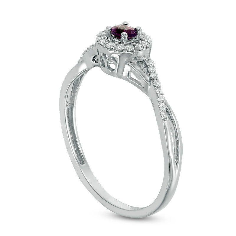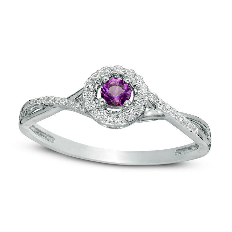 This exquisite promise ring is the perfect way to start your romantic journey. Crafted in sterling silver, the chic design showcases a stunning 3.0mm amethyst in a frame of dazzling diamonds. The dual shank features twisted diamond-lined and polished ribbons, adding to its elegance. Glittering with 1/8 ct. t.w. of diamonds, this ring boasts a lustrous shine that is sure to catch everyone's attention. It can be custom-made to fit your loved one's ring size. Please note, sterling silver rings cannot be resized once purchased.