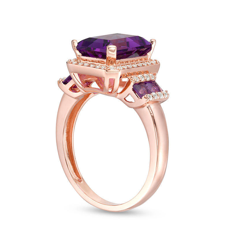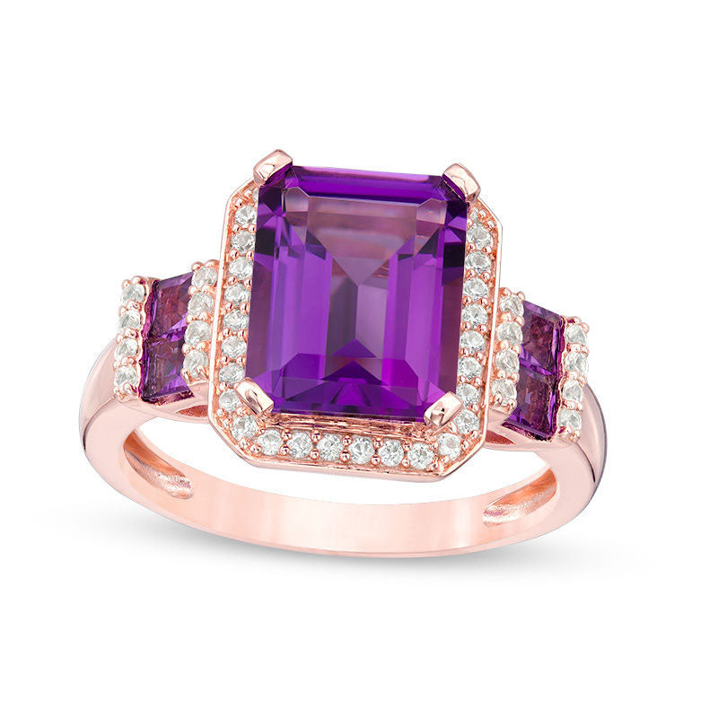 Elevate your style game with this stunning gemstone collar ring. Crafted in sterling silver with a luxurious 14K rose gold plate, this extraordinary piece showcases a vibrant 10.0 x 8.0mm emerald-cut purple amethyst center stone, encircled by a glistening frame of lab-created white sapphires. The center design is further accentuated by two pairs of 2.5mm princess-cut amethysts, complemented by dainty round created sapphire ribbons on either side. This ring is polished to a dazzling finish, ensuring you receive endless compliments. This ring is customized to fit comfortably on your finger, so you can enjoy it for years to come. Please note that resizing of sterling silver rings after purchase is not possible.