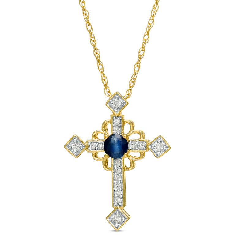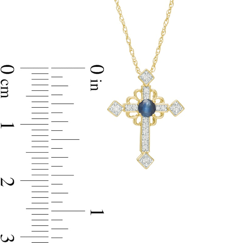 Blue Sapphire and 0.05 CT. T.W. Natural Diamond Ornate Cross Pendant in 10K Yellow Gold