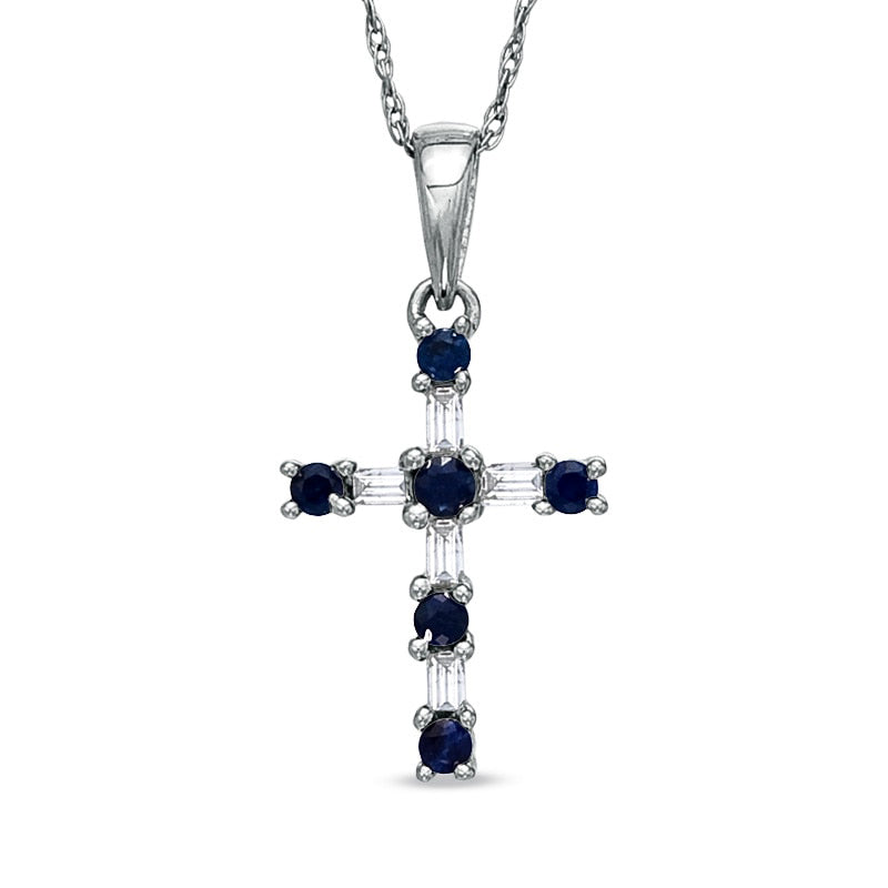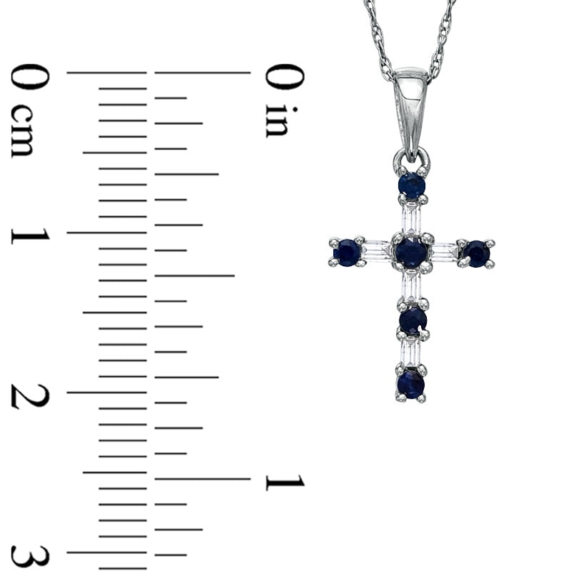 Blue Sapphire and 0.1 CT. T.W. Baguette Natural Diamond Cross Pendant in 10K White Gold