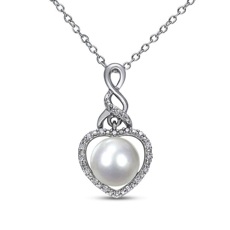 Button Cultured Freshwater Pearl and 0.07 CT. T.W. Natural Diamond Heart Frame Cascading Twist Drop Pendant in Sterling Silver
