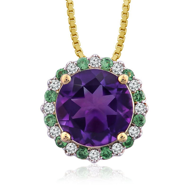 Captivating Color 10.0mm Amethyst, Tsavorite and 0.13 CT. T.W. Natural Diamond Frame Flower Pendant in 14K Gold