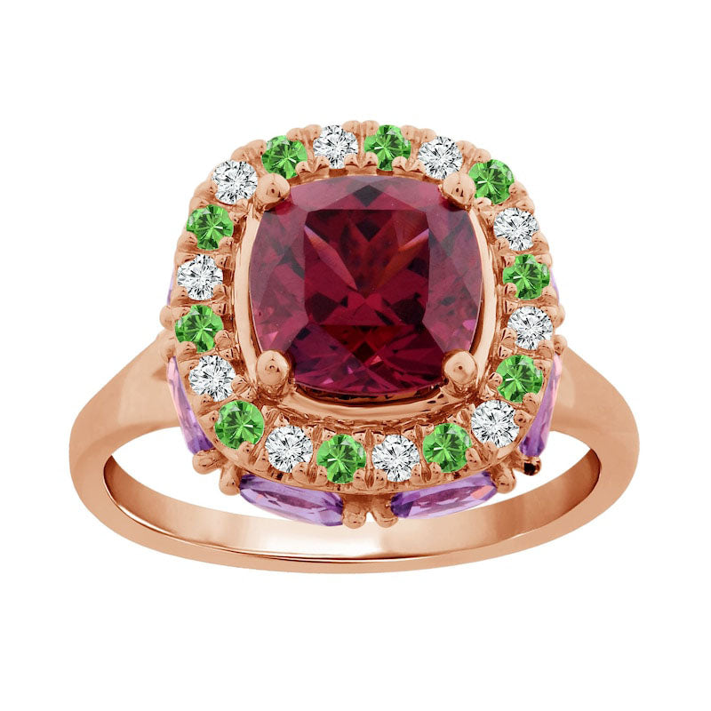 Captivating Color Cushion-Cut Rhodolite, Amethyst, Tsavorite and 0.20 CT. T.W. Natural Diamond Frame Ring in Solid 14K Rose Gold
