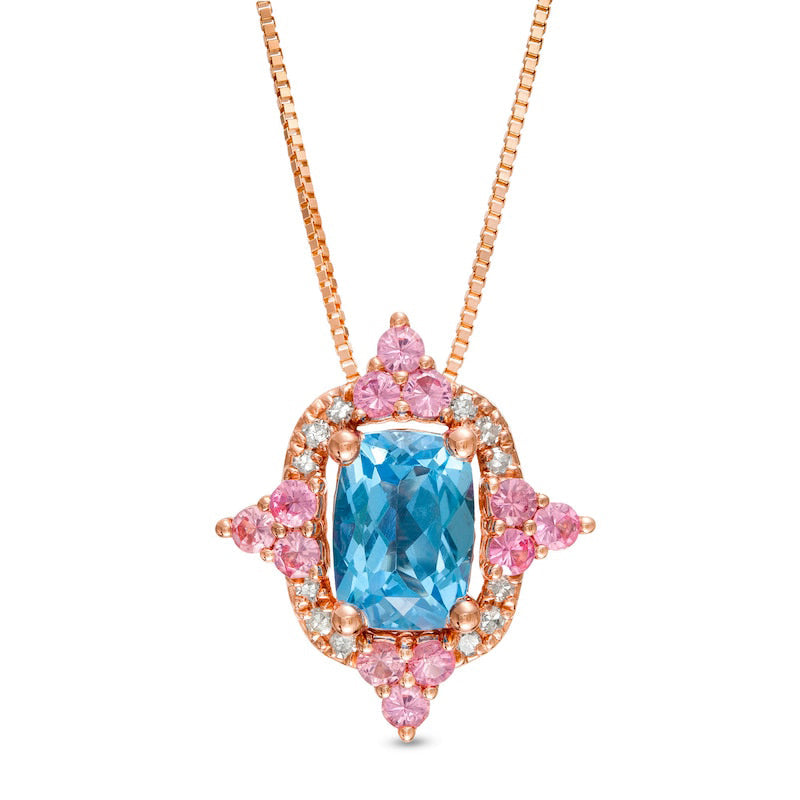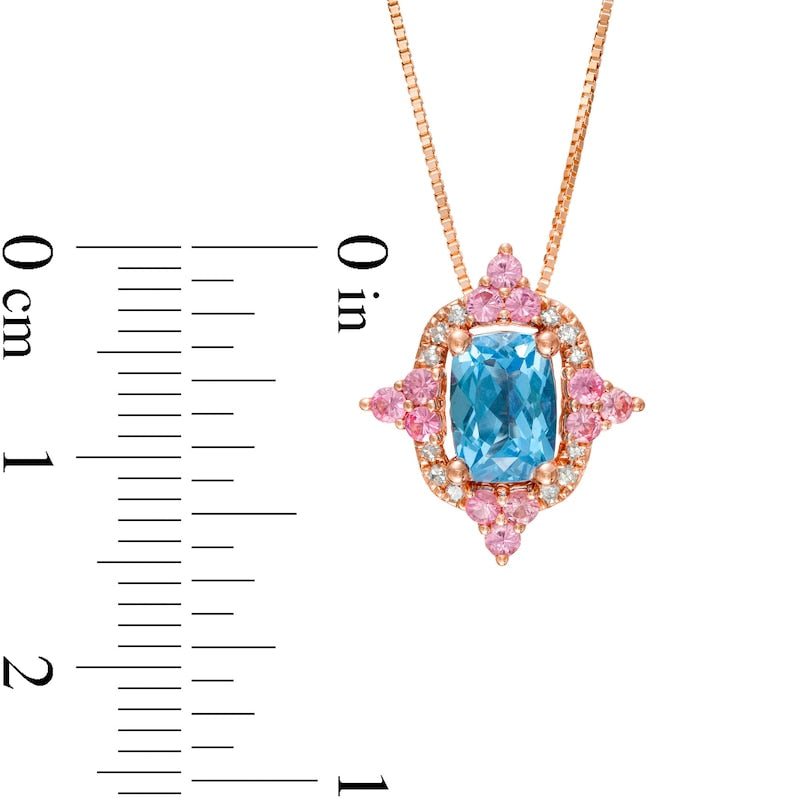 Captivating Color Swiss Blue Topaz, Pink Spinel and 0.05 CT. T.W. Natural Diamond Frame Pendant in 14K Rose Gold