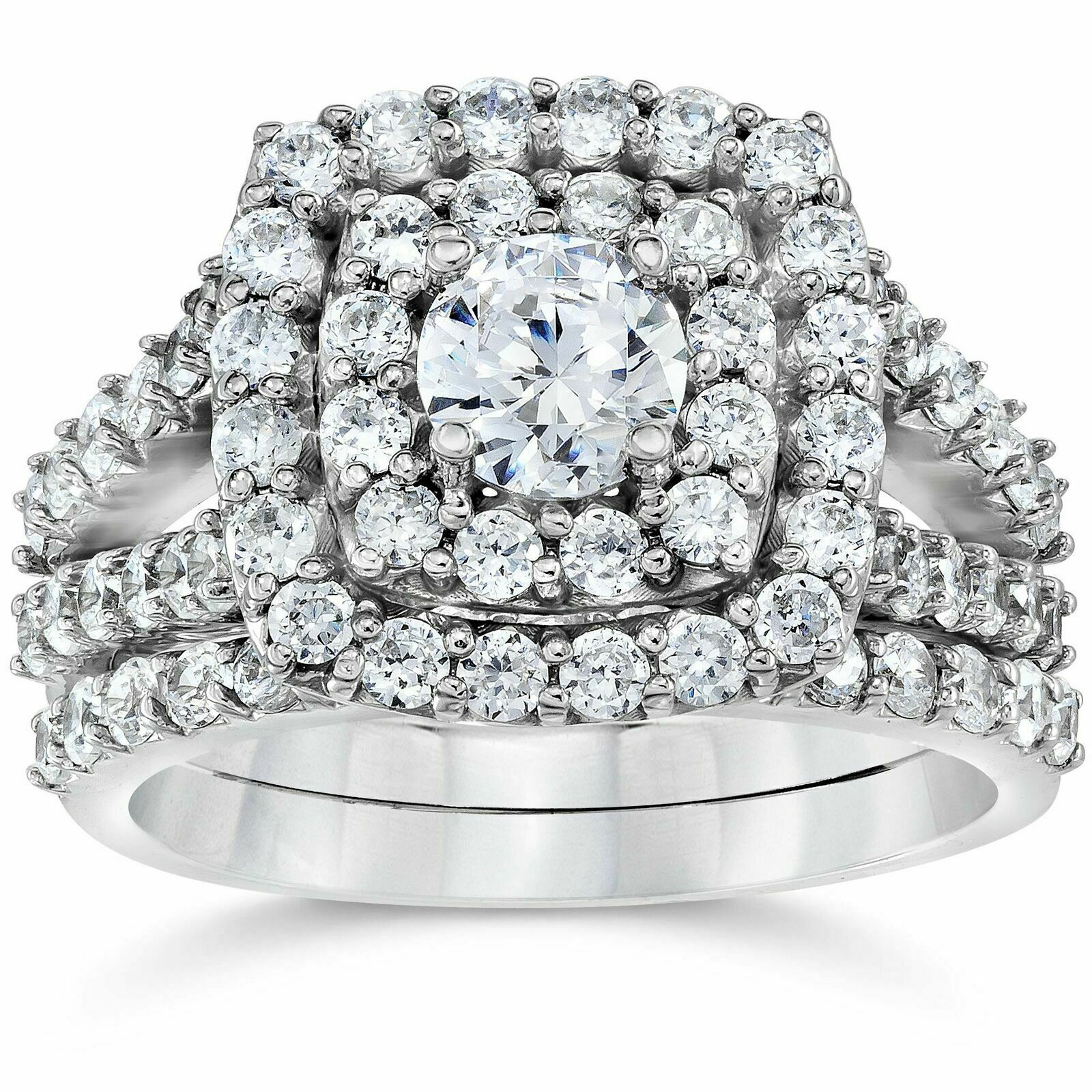 Women's ring features a 1/2ct round cut diamond and 71 round accent diamonds set in solid 10k white gold. The center stone has a double cushion halo that encircles it giving the total ring a larger look and feel. This ring set is stunning and a real show stopper. Matching wedding ring is included.