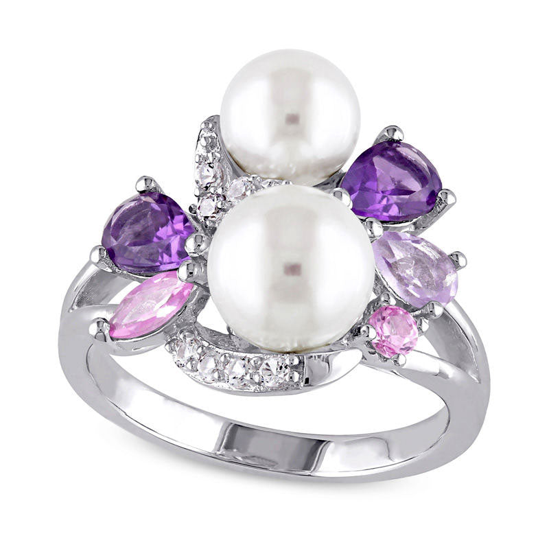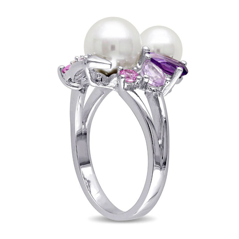 Cultured Freshwater Pearl Amethyst and Lab-Created Pink and White Sapphire Cluster Ring in Sterling Silver