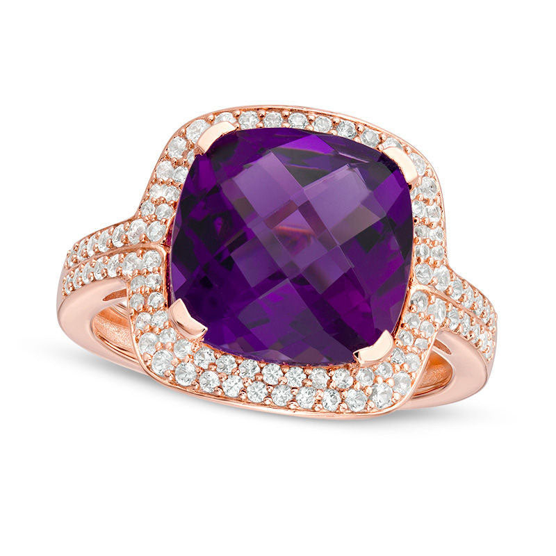 Cushion-Cut Amethyst and Lab-Created White Sapphire Frame Double Row Ring in Sterling Silver with Solid 14K Rose Gold Plate