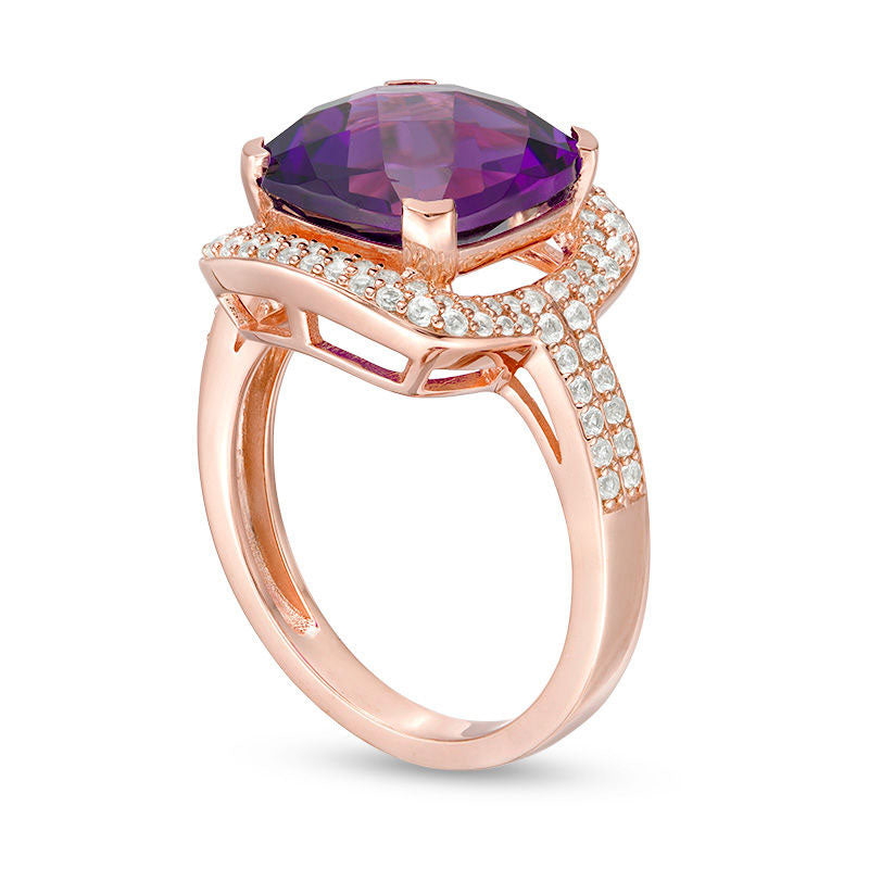 Experience the ultimate in fashion-forward elegance with this breathtaking Cushion-Cut Amethyst and Lab-Created White Sapphire Frame Double Row Ring. Exquisitely crafted from sterling silver with beautifully polished 14K rose gold plate, this striking piece features an 11.0mm cushion-cut amethyst in a stunning shade of purple. Two rows of dazzling lab-created white sapphires encircle the center stone and trail down the shank, lending a truly luxurious look to the ring. With its captivating design and irresistible charm, this ring is perfect for any occasion – day or night. Plus, it can be custom-made to fit her ring size. Please note that, once purchased, sterling silver rings cannot be resized.